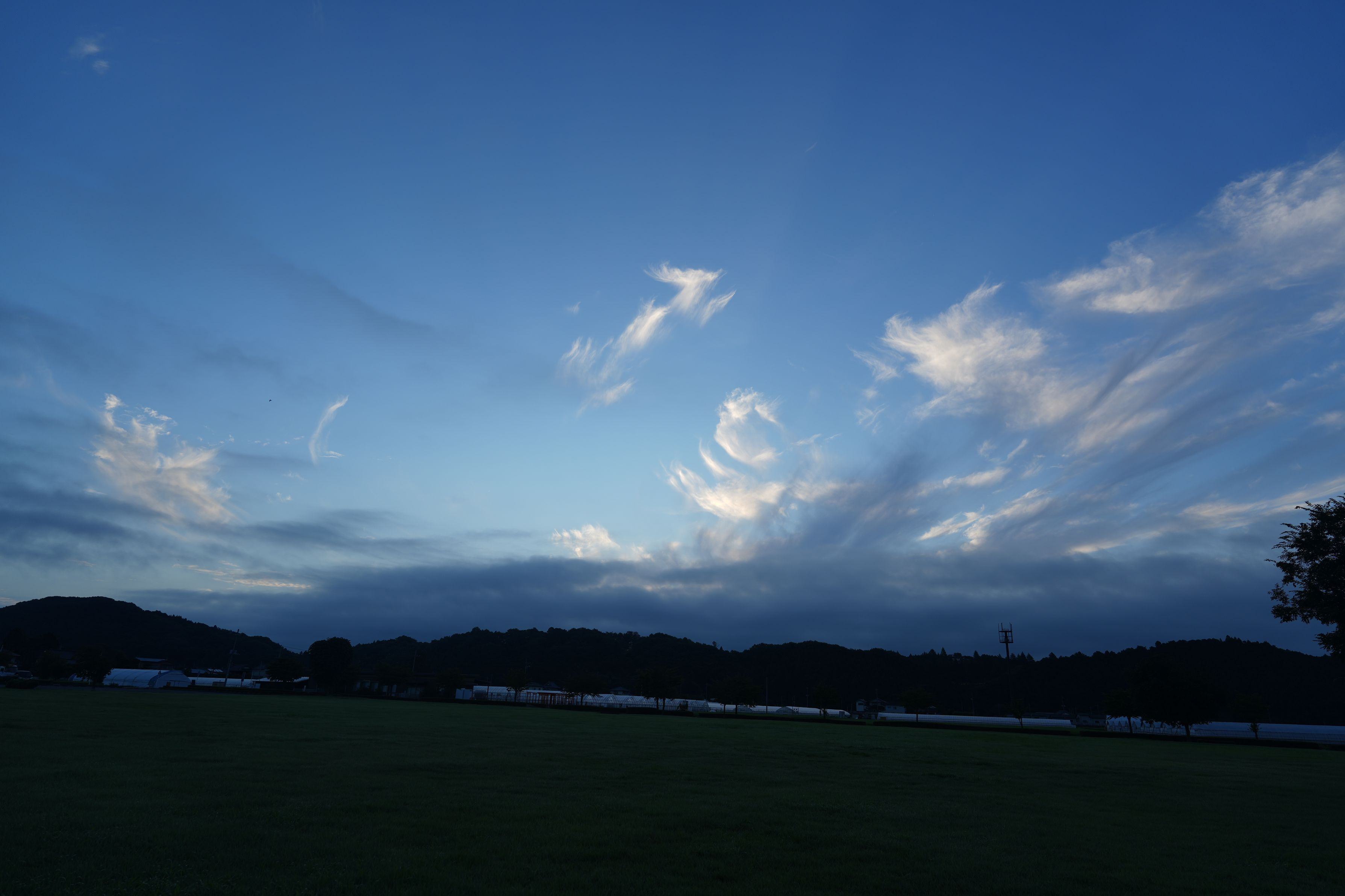 夜の静寂が少しずつほどけ、空に光が差し込む夜明け前の一瞬を捉えた風景。羽のように広がる雲は、朝を迎える空のささやきのよう。闇と光が交わる境界線で、世界が目を覚ます気配をそっと描き出している。