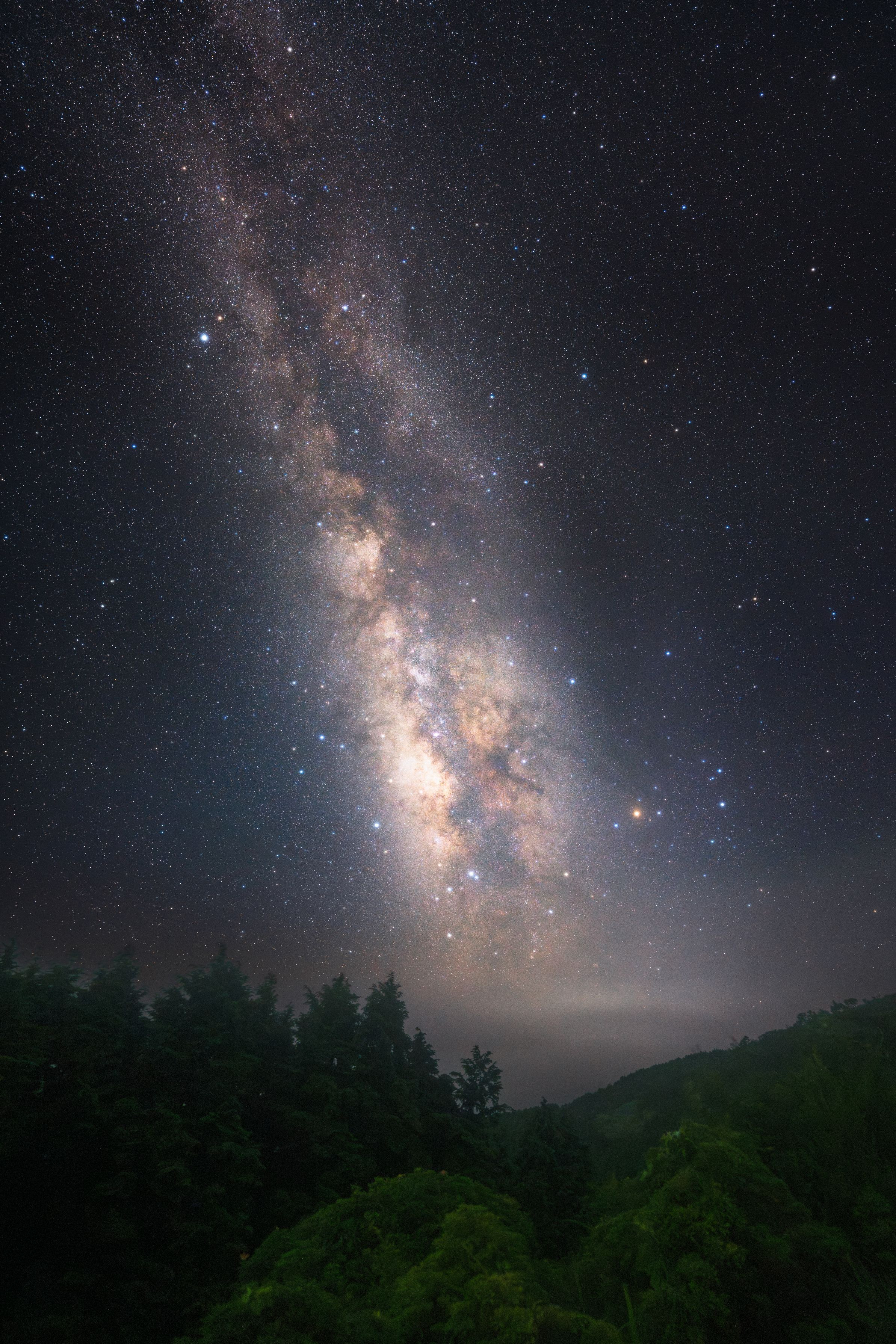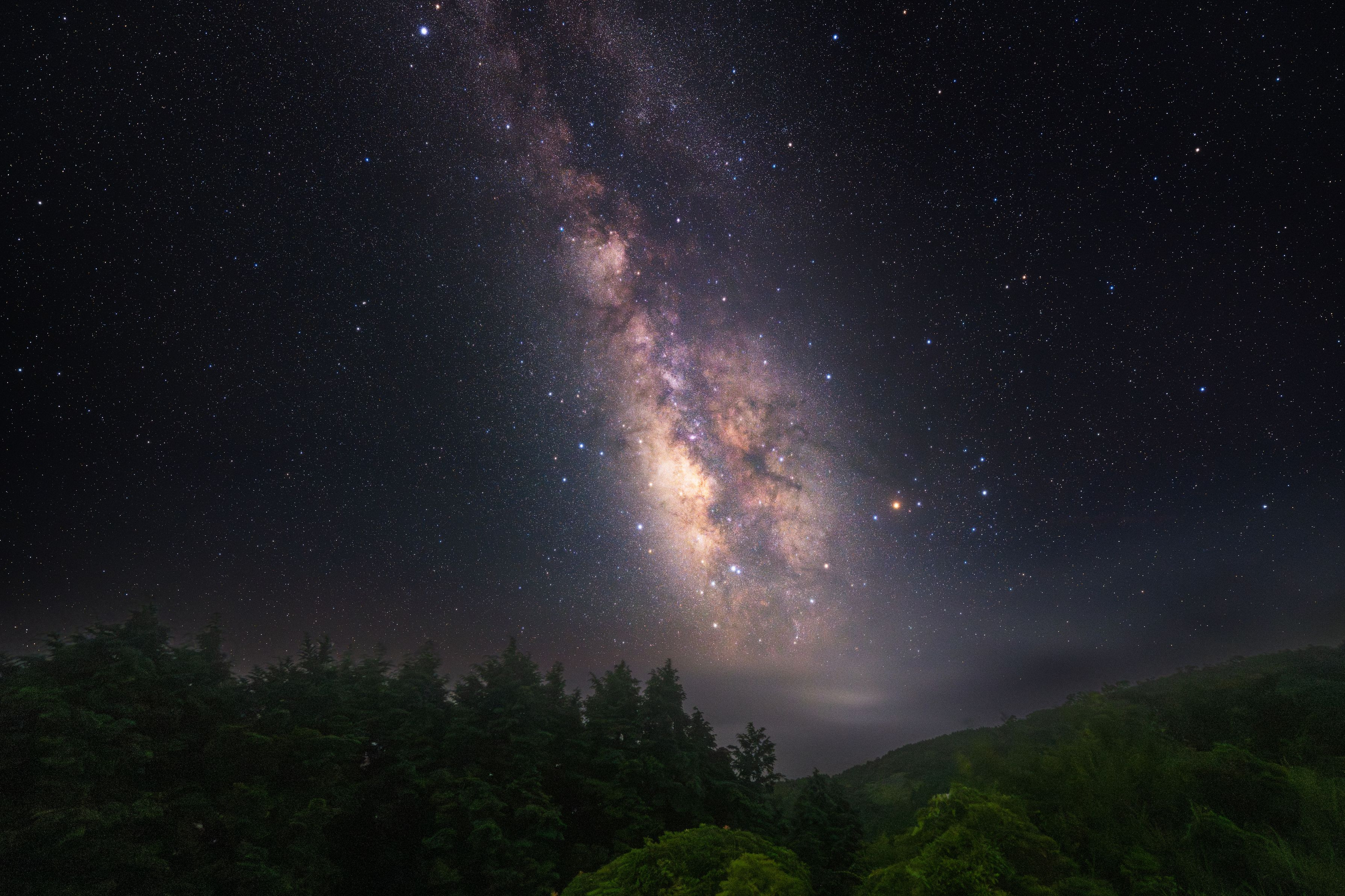 肉眼で見ると天の川が淡い雲のようにアーチ状に見えました。