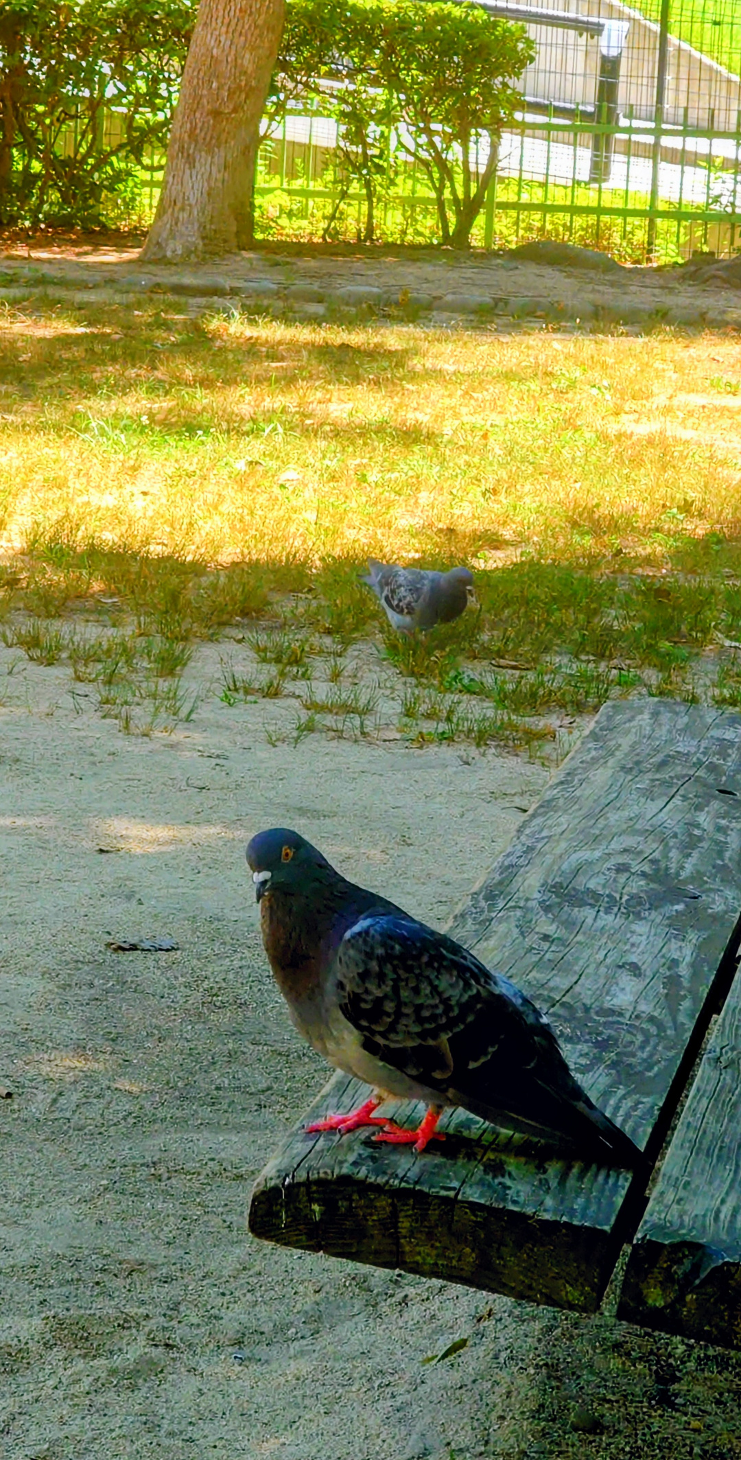 いつもの公園に居る人懐っこい鳩。 カンカン照りでお互い日陰のベンチで休憩。