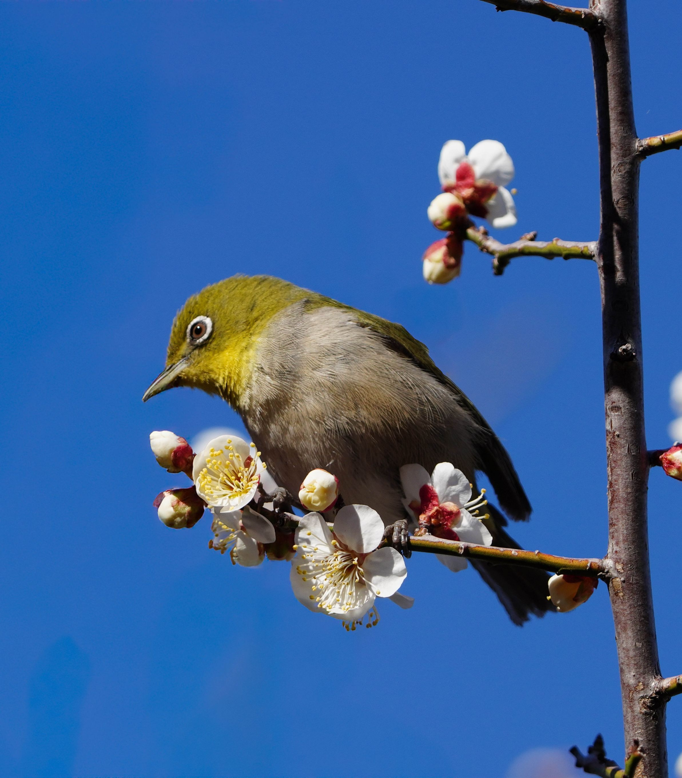 目白が蜜を求めて梅の木に来た瞬間です
