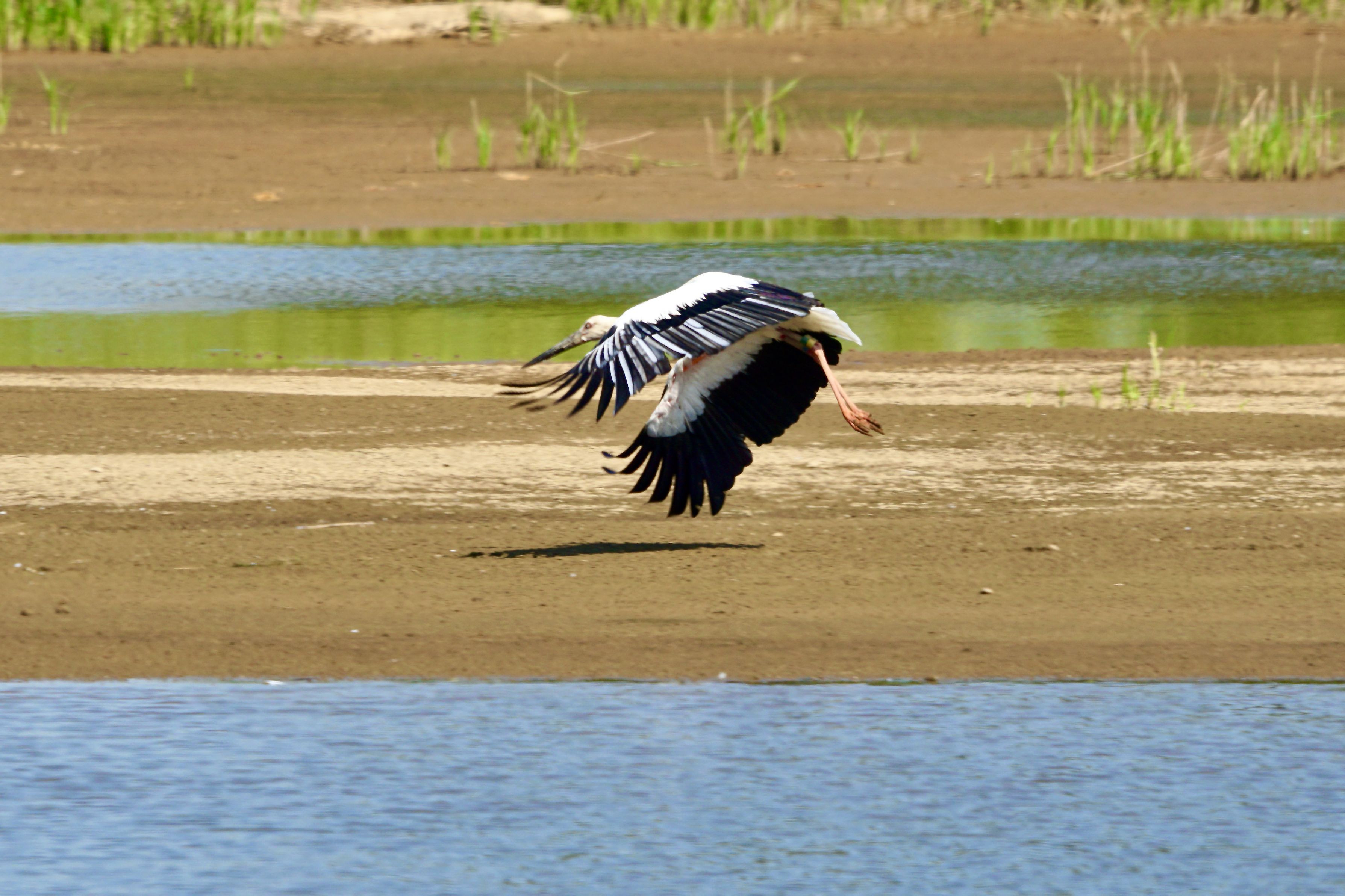 水不足の用水池のコウノトリ なにかに怒ったあと、飛び立った瞬間 一脚を据える暇もなく、大空へ 手持ちで400ミリ&一脚の重さはキツイですね、、、、(トホホ