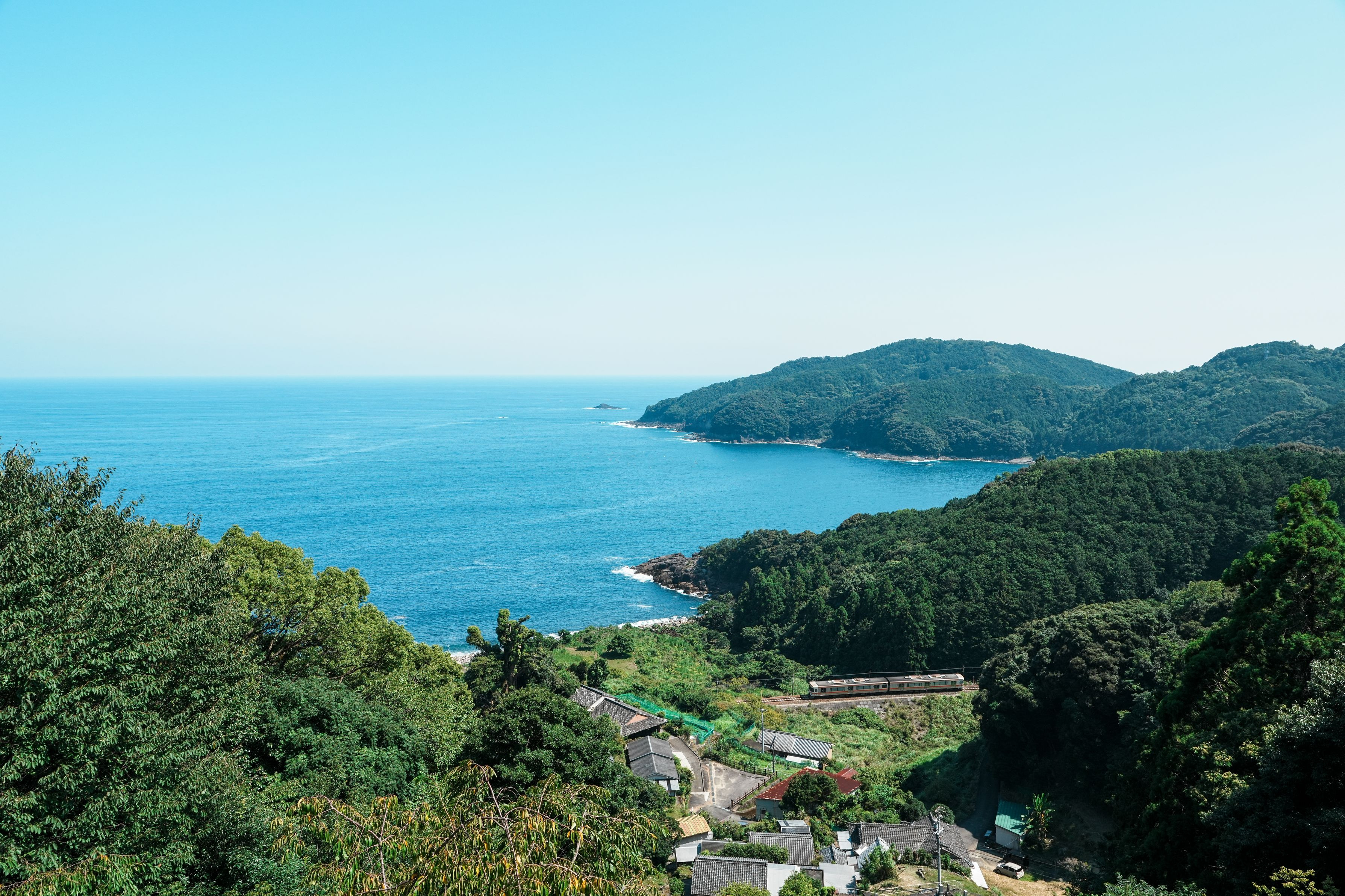 JR東海紀勢本線の波田須駅から新鹿駅間、2両編成の気動車が海岸線を走ります。