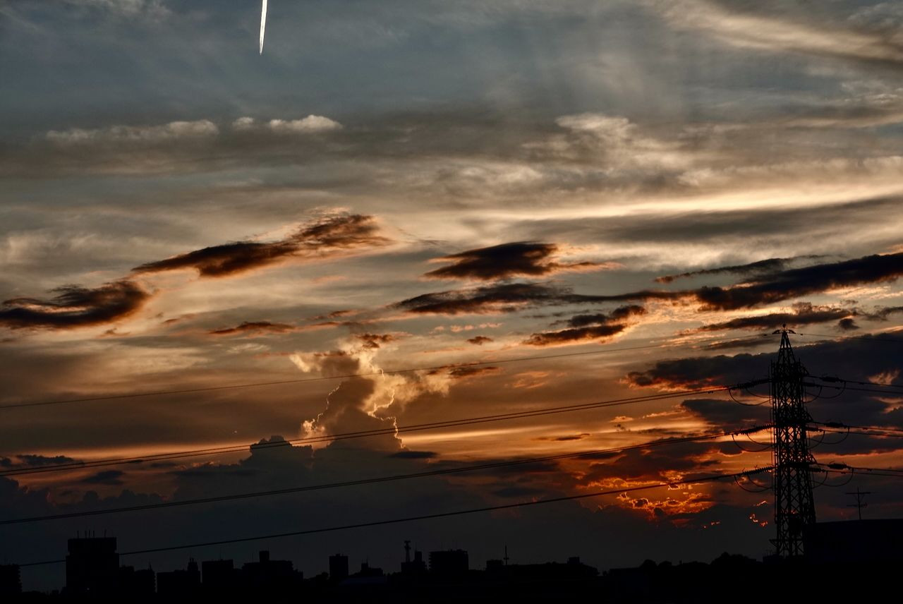地域の夏祭りに出かけようと西を見たところ、夕焼けをバックに積乱雲と飛行機雲が迎えてくれたので撮りました。