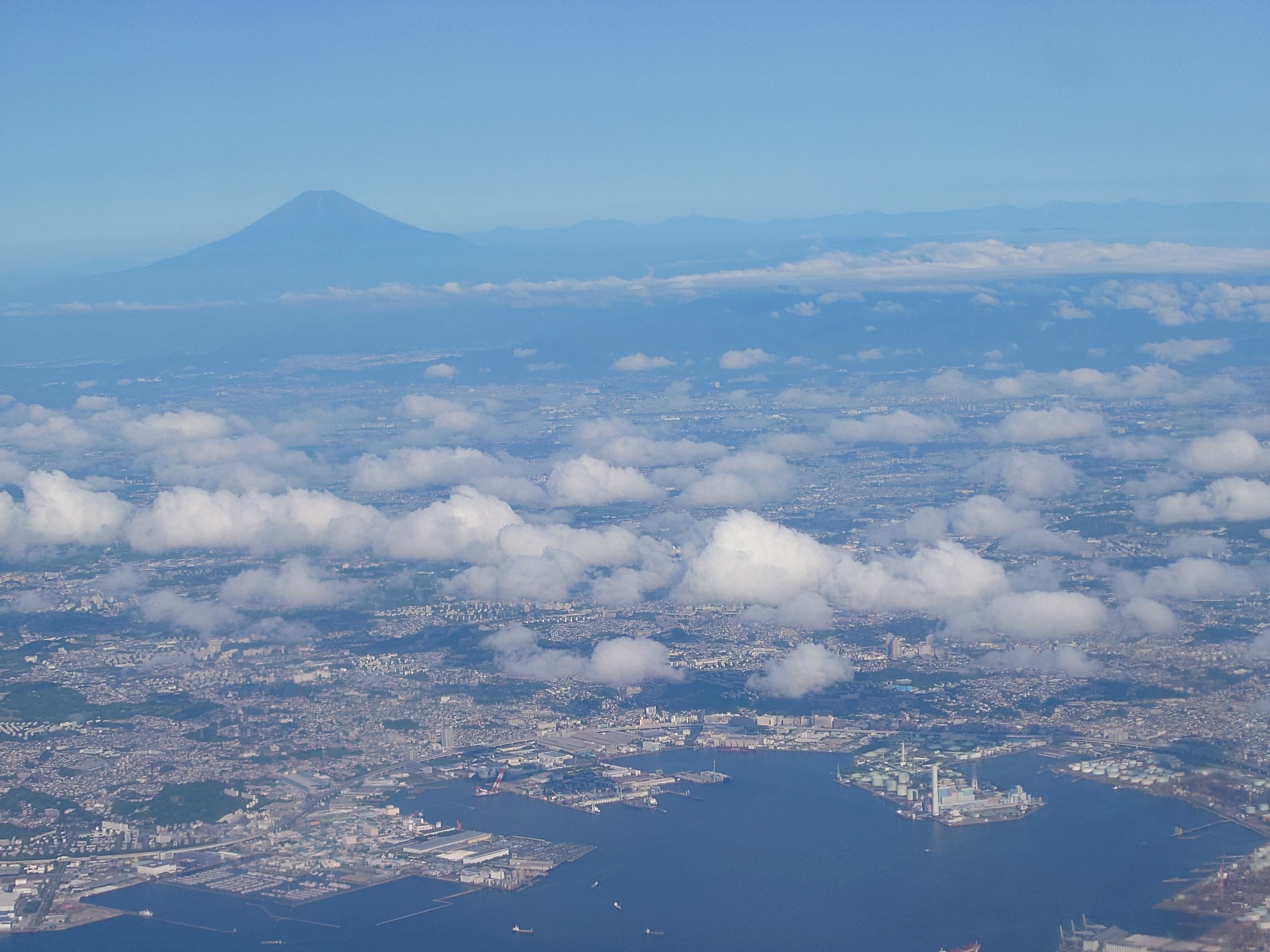 沖縄行きで晴れた日だったので神奈川川崎あたりから富士山がきれいでした。雲も綿菓子のように並んでいておもしろいです。