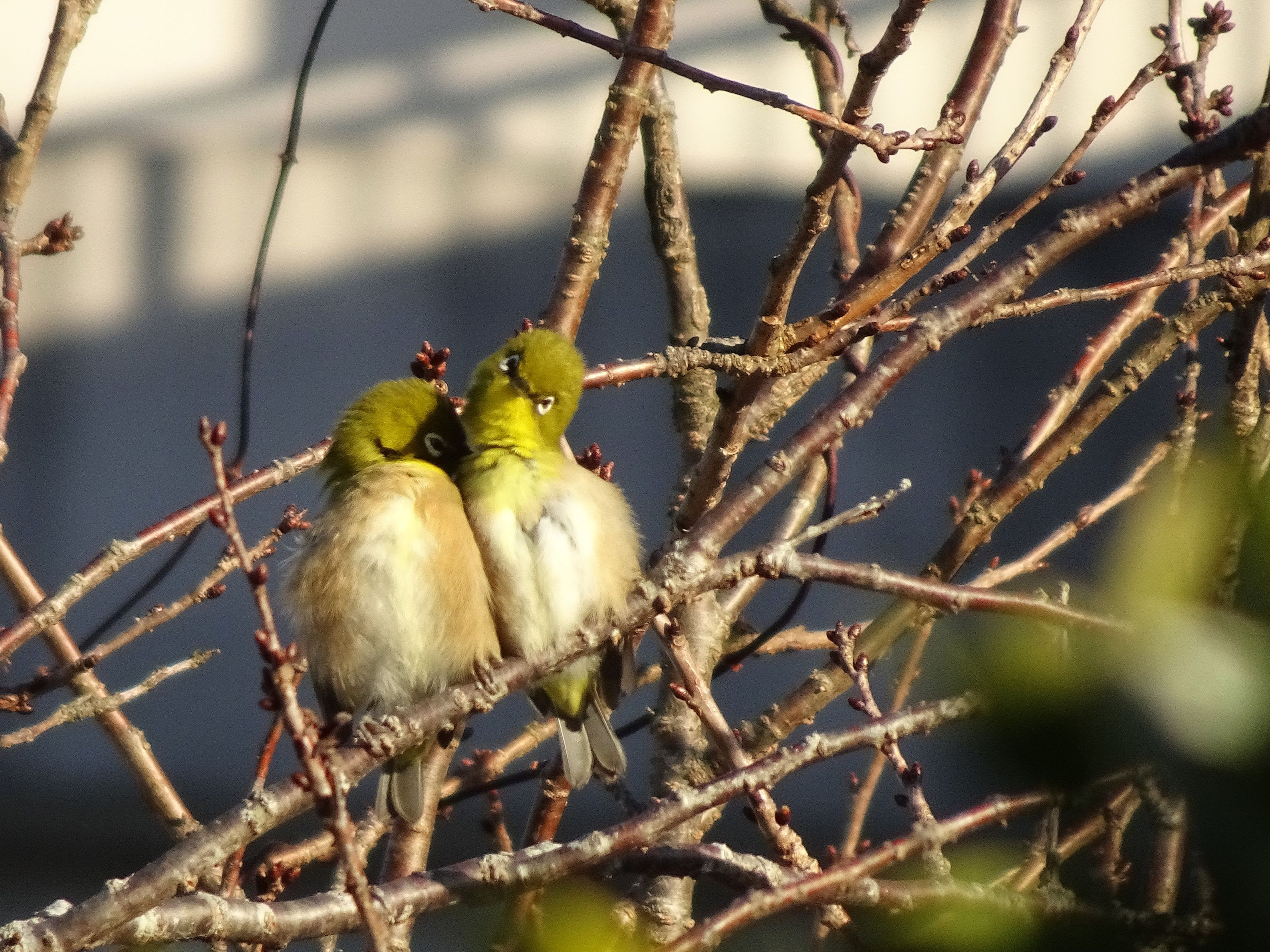 お互いにくちばしでつんつんしていたところを見つけて撮影したものです。 寄り添いながらウトウトしているようにも見えました。可愛かったです!
