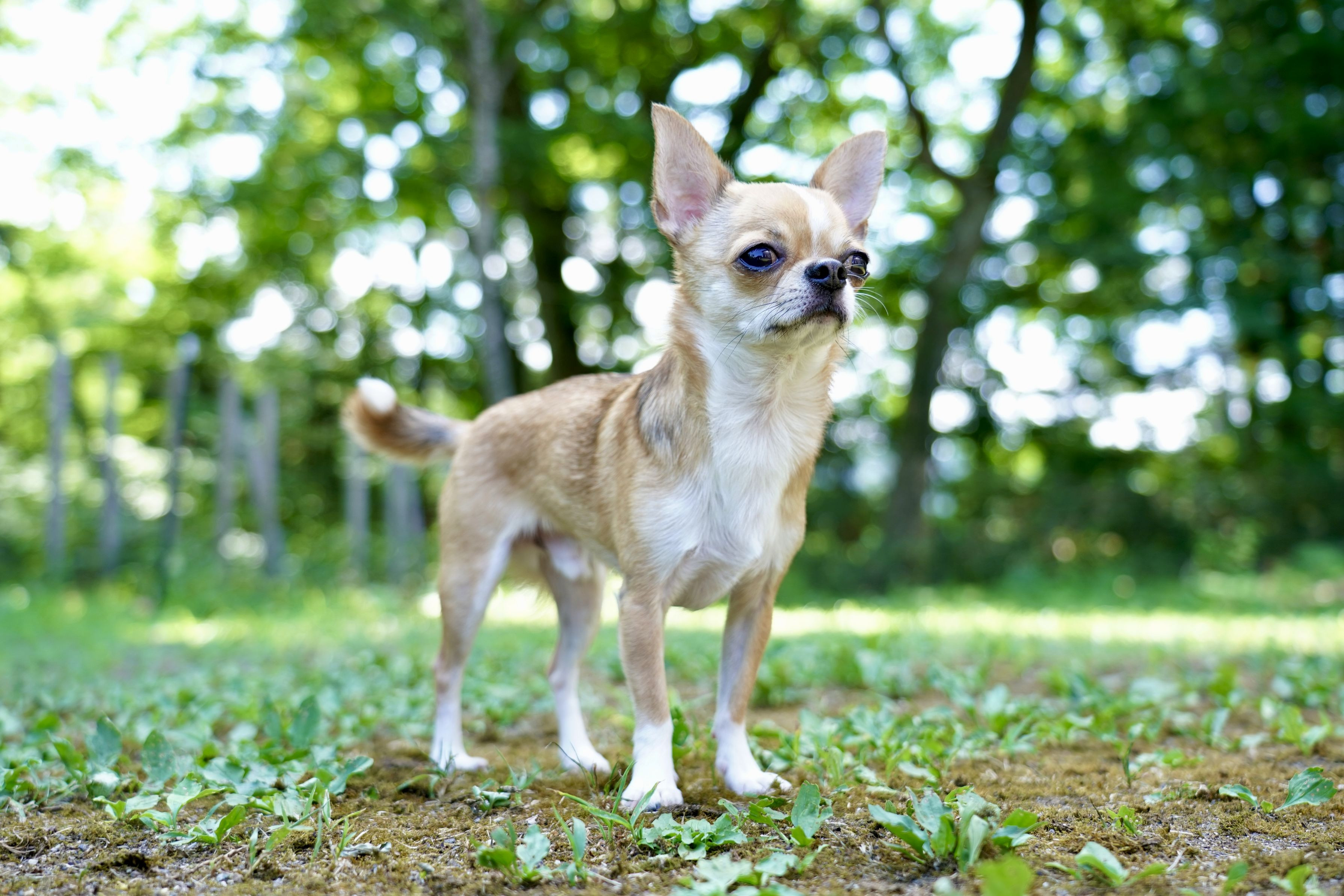 清々しい朝、お気に入りの裏庭ドッグランでの一コマ。 視線の先には、大好きな母ちゃんの姿が。