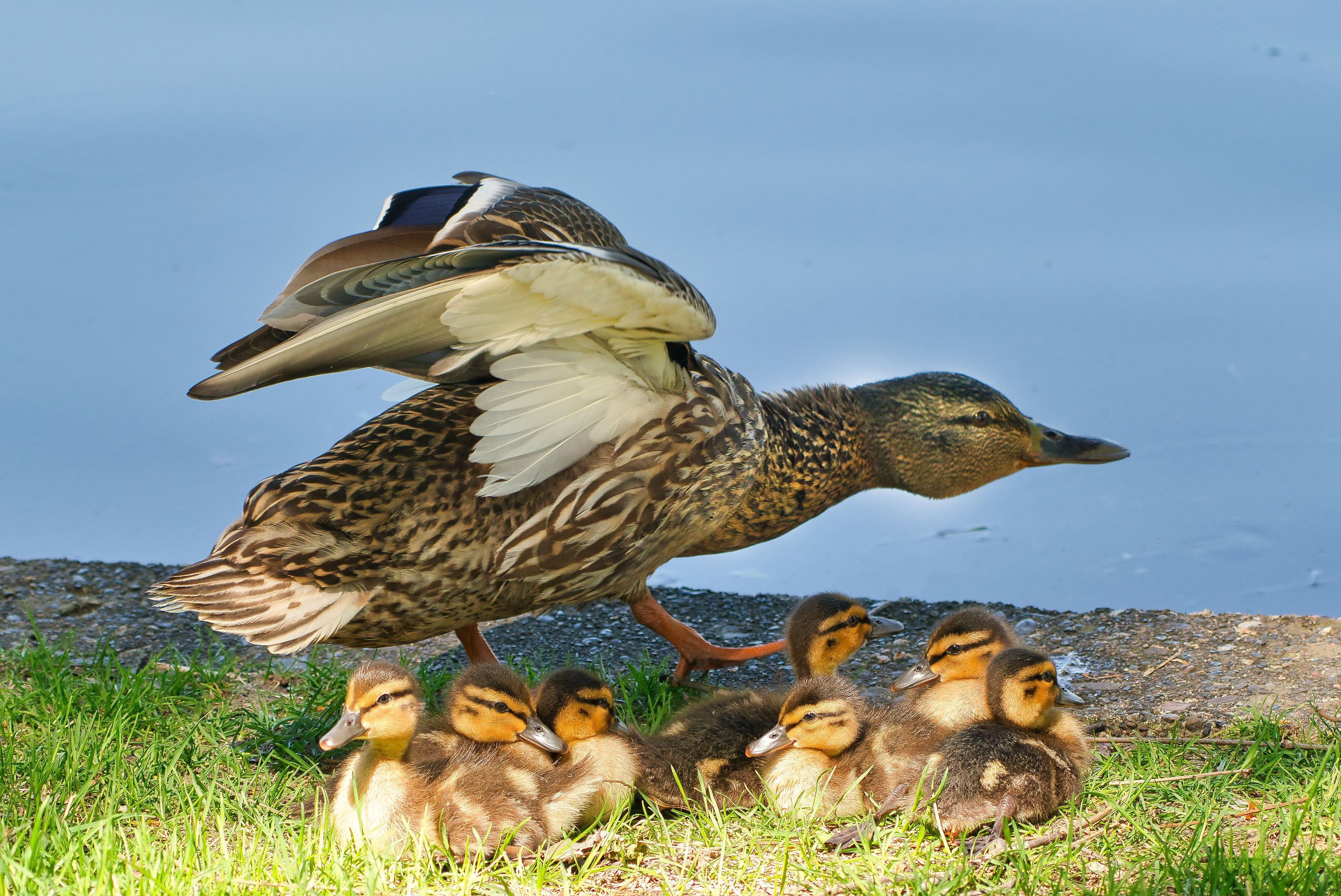 カモの雛、暑い日差しから親鳥にガードされています