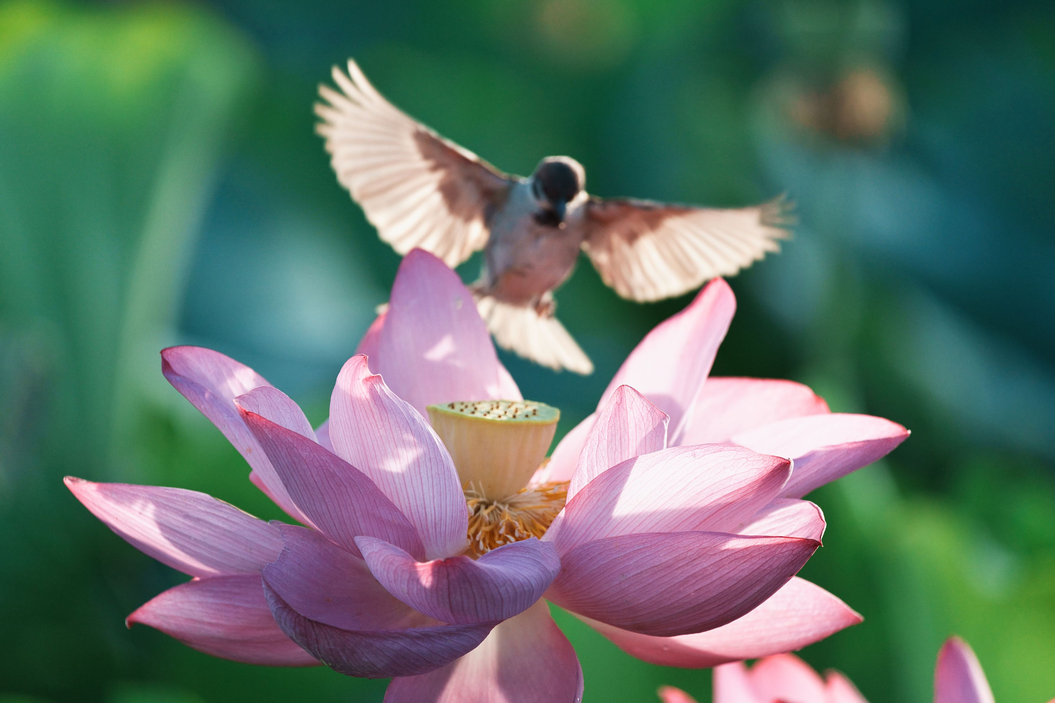 製品情報>My Sony>αcafe>蓮の花に降りるスズメ(bababa222さん)