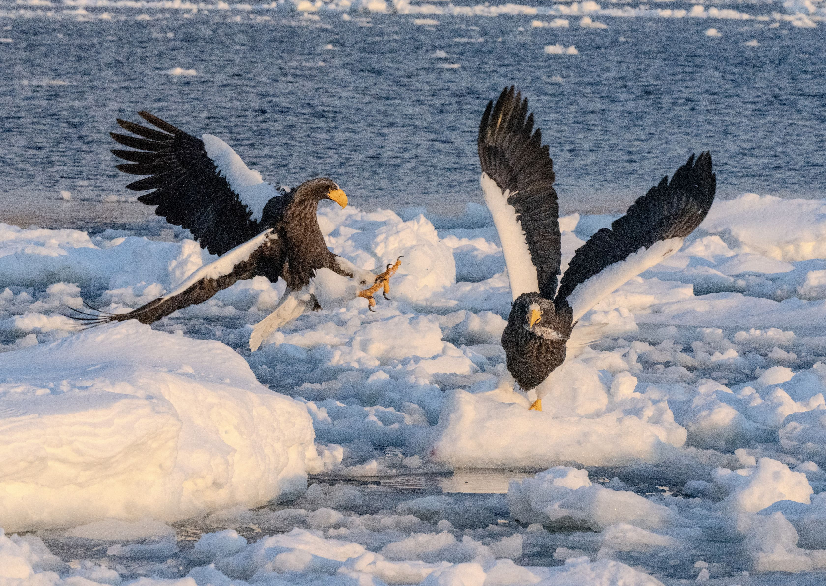 オオワシ2羽が流氷上で魚の取り合いをしていました。猛禽類は羽を少しでも失ったり、傷ついたりするとうまく飛べなくなるので、激しい争いはしないようです。