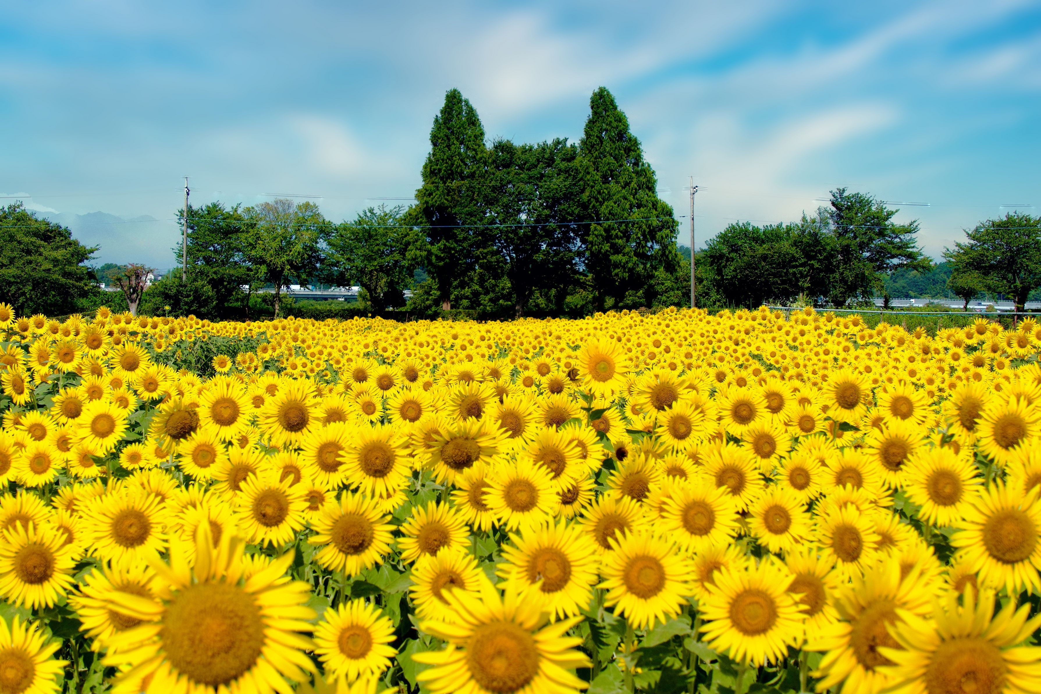ひまわり畑とねこねこの木を朝の順光で撮影