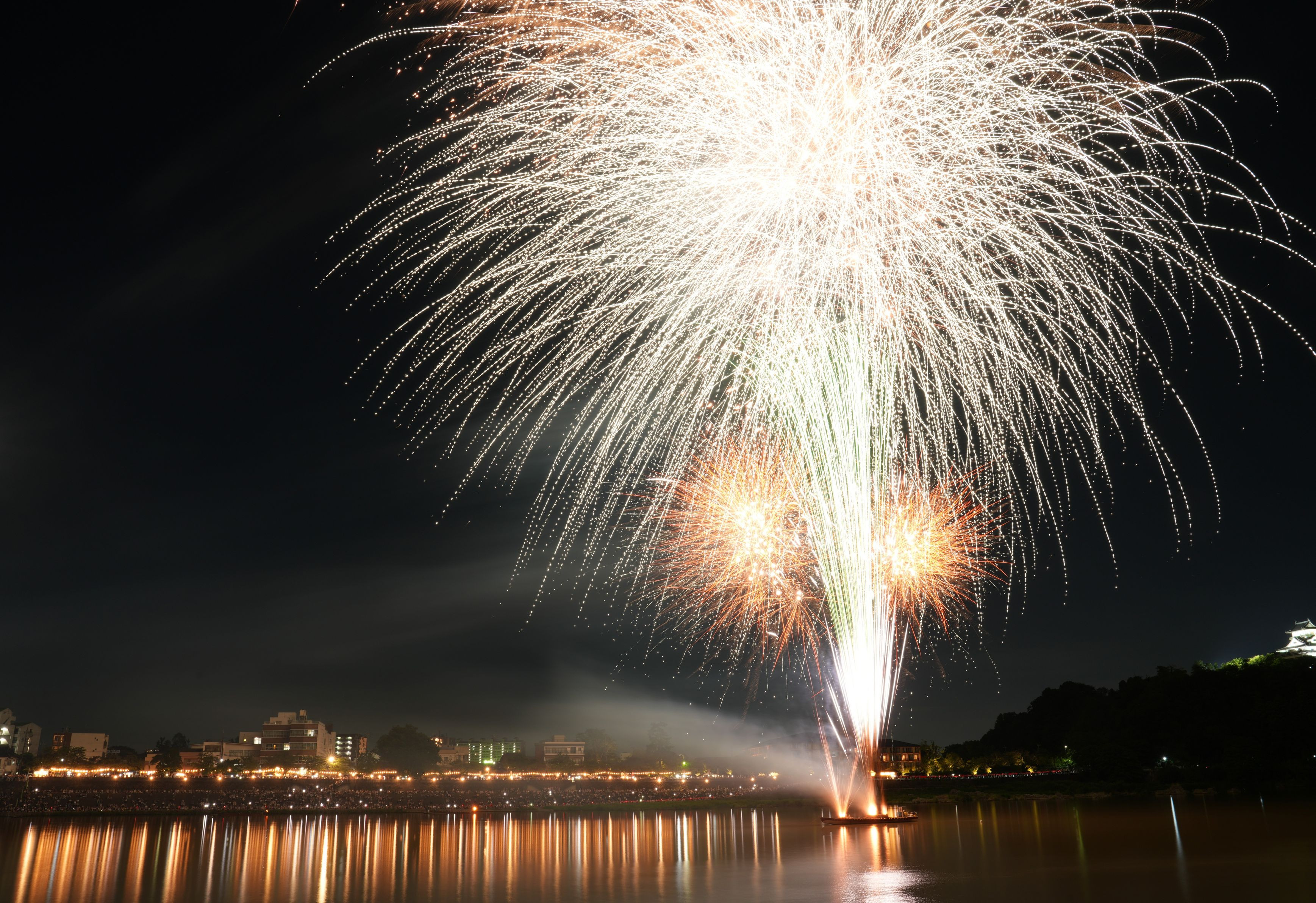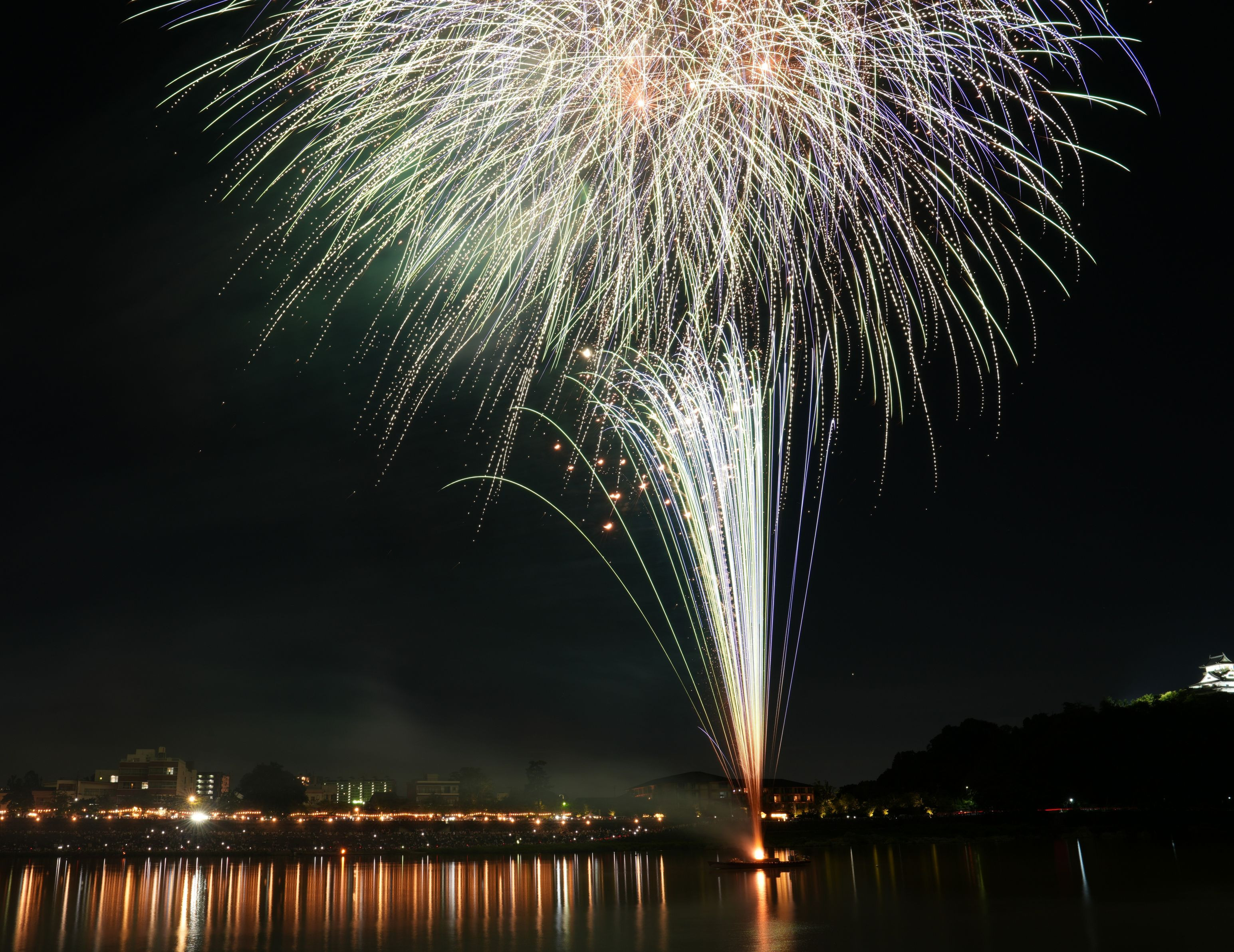 犬山ロングラン花火8日目、私は4日目です。3日目は14mmで縦構図にしましたがラストが収まりきらず、4日目はお城と上は諦めて水面のリフレと下狙いに変更しました。 果たしてラストに狙い通りの花火が上がるかどうか、でしたが願いが通じて上がってくれました。10分で失敗は許されませんが10日間あるので再チャレンジはできます。来年は大きな花火大会で撮影したいと思います。
