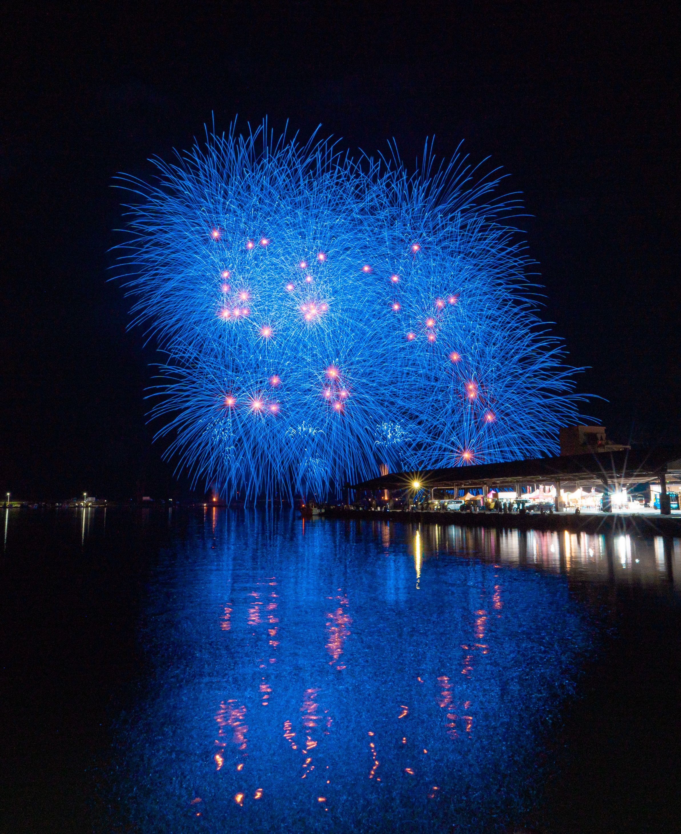 三重県尾鷲市のおわせ港まつりでの撮影です。ブルーだけの明るい花火が、まるで 赤い星から広がる青い銀河のようでした。