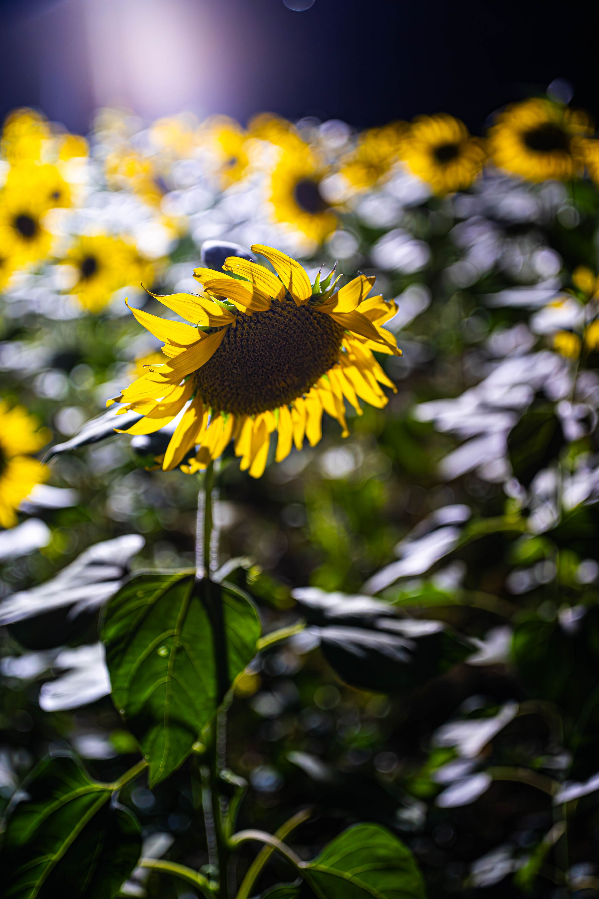 華やかな明るいイメージのひまわりですが、夜は揃って俯いています。陽の光を受けて輝くひまわりですが、影る時もあるのです。しかし俯いても開いた花は華やかさを失いません。 その神秘的な様子が見て取れるのではないかと思います。