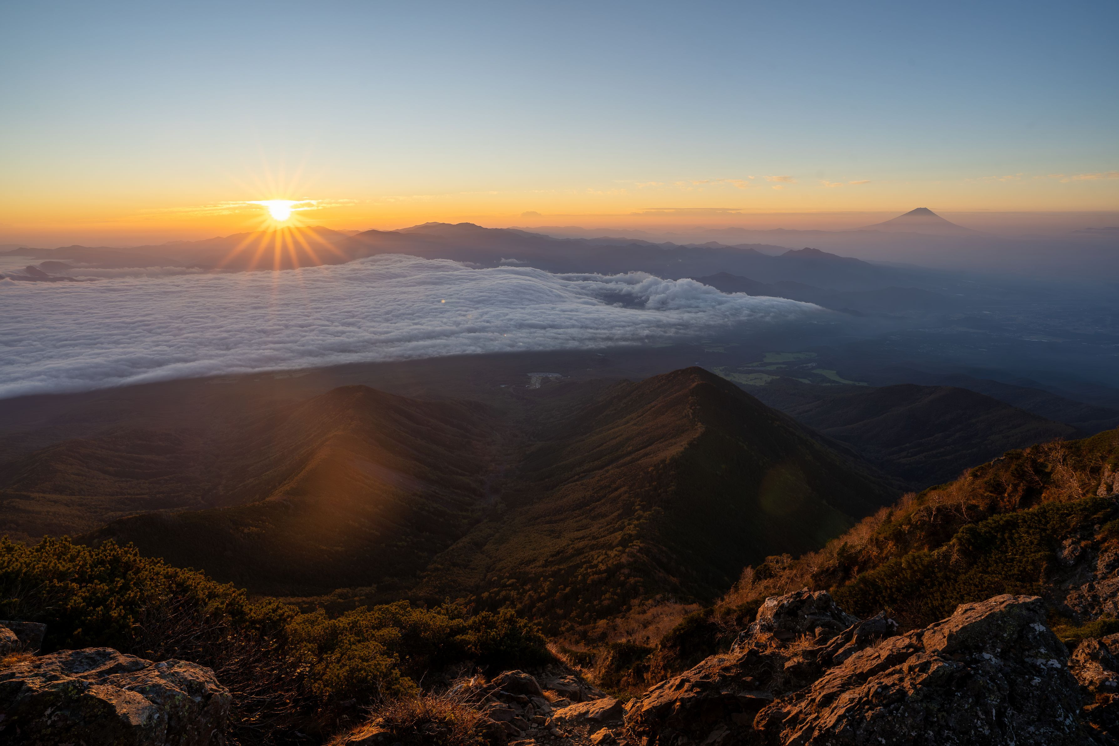 赤岳頂上から。朝日に照らされて一面が陽の光でオレンジ色に染まる瞬間。ほんのわずか時間、みんなが同じ方向を向いて感動を共有する素晴らしい瞬間です。右側には富士山も照らされています。
