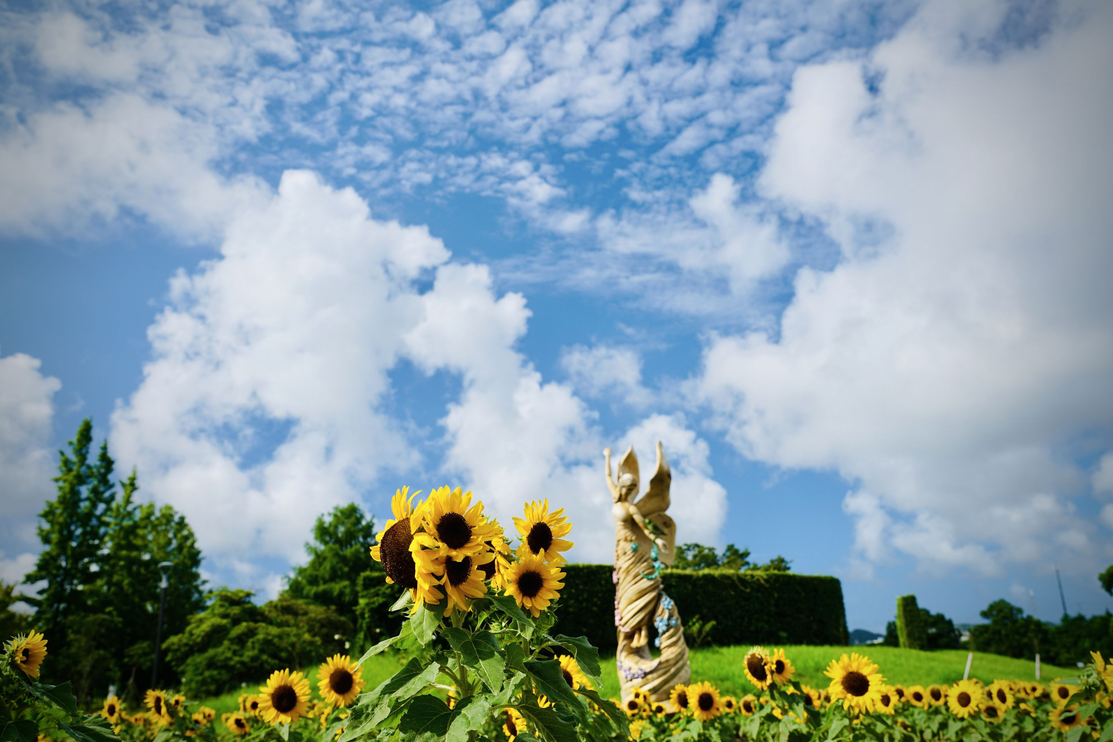 田辺市新庄公園 花と緑の妖精モニュメント 夏の間は向日葵にかこまれます。
