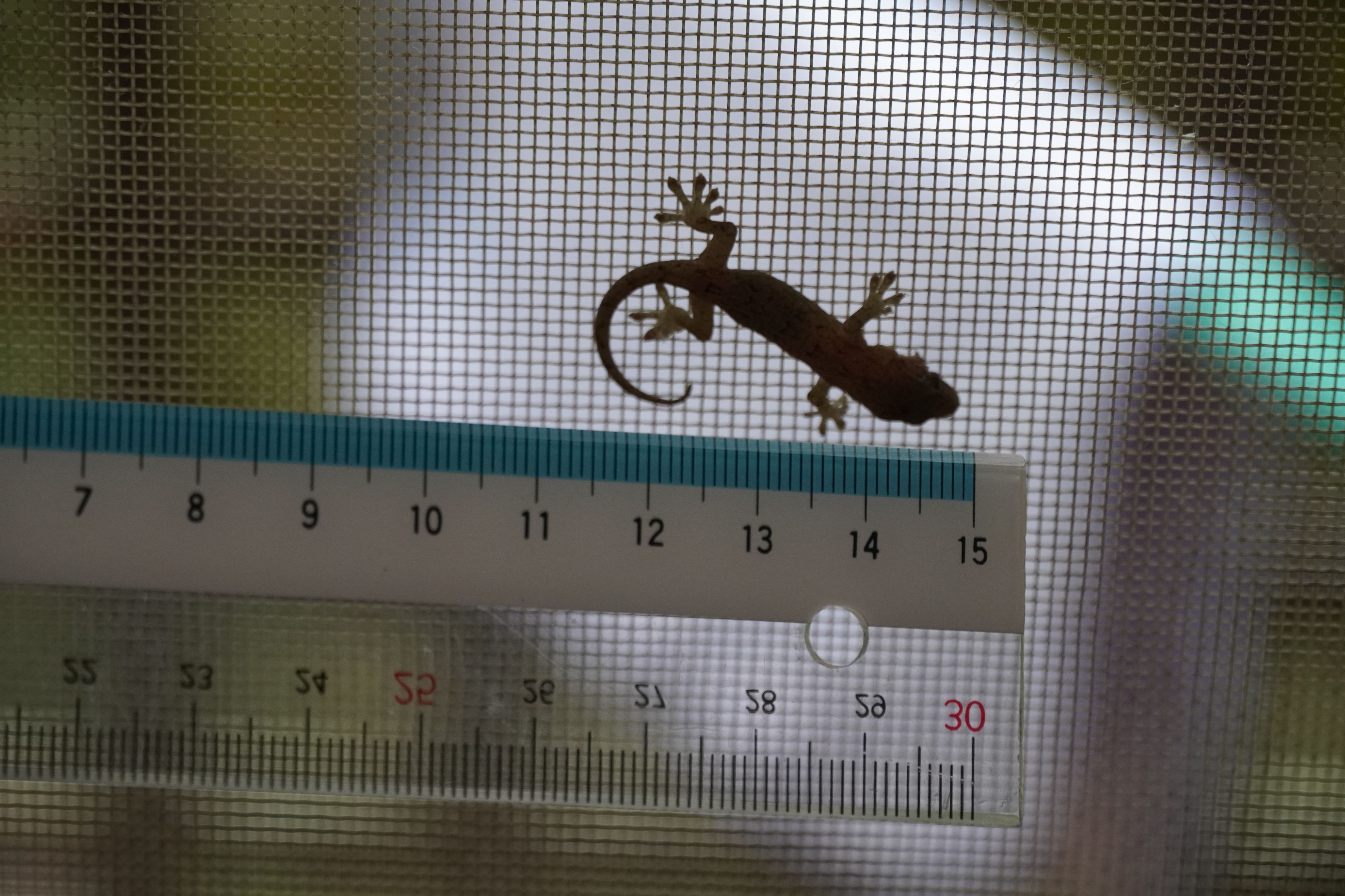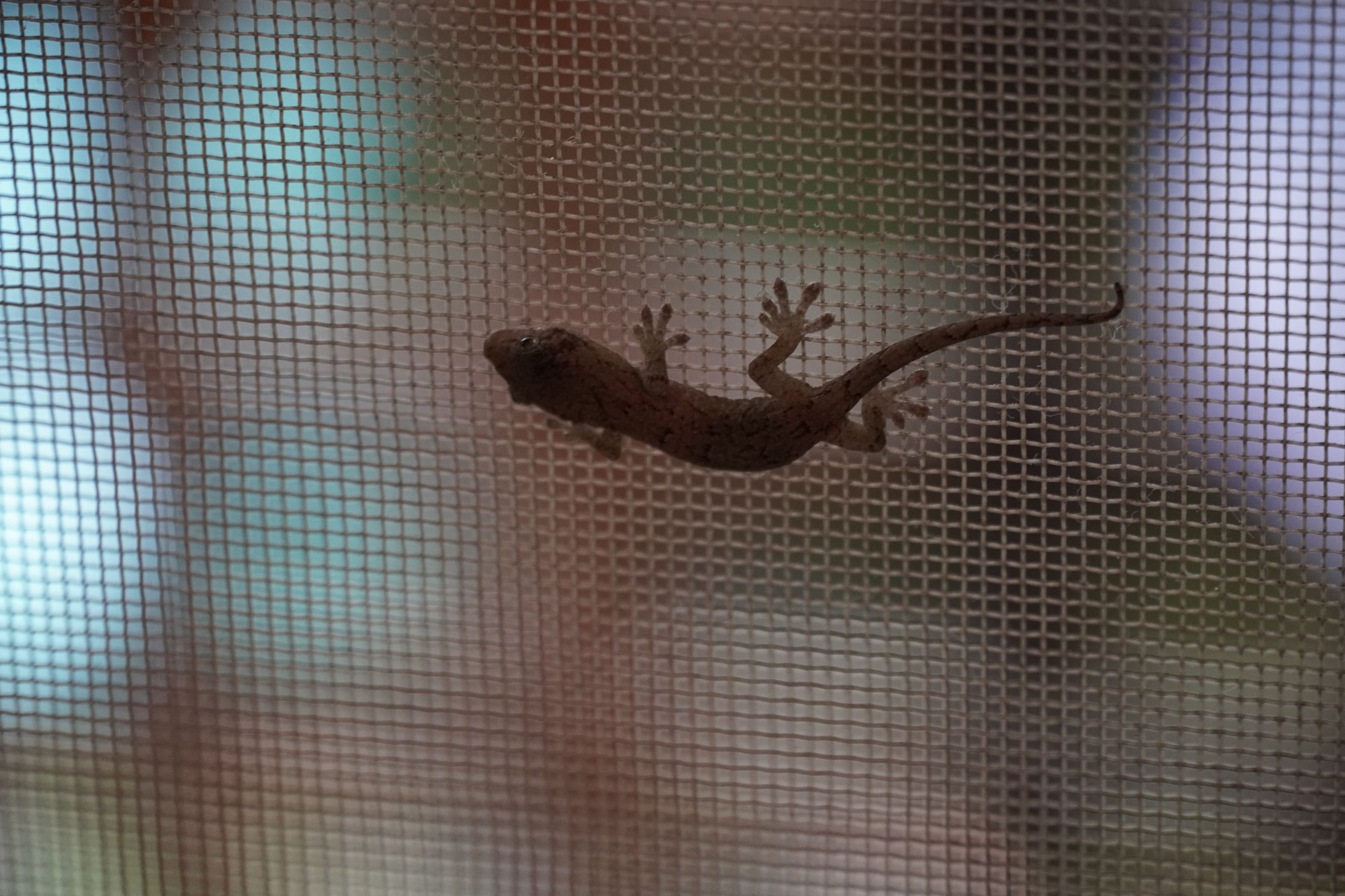 朝、リビングの網戸にヤモリの子供が。 先日は大きなヤモリが家の入ってきて大騒ぎ その子供かな?家の守り神ゆっくりしていってね。