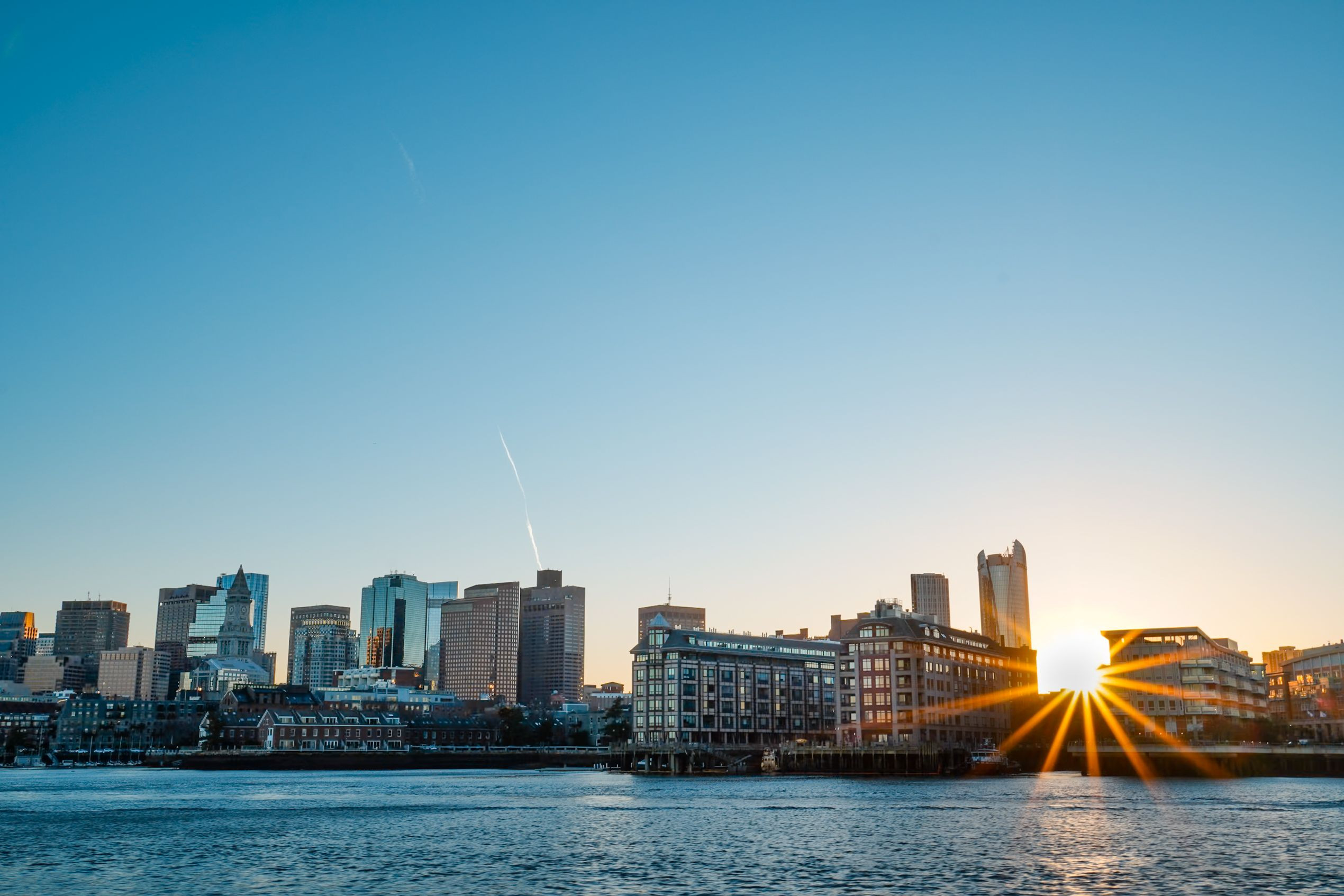 水面越しに広がる都市の輪郭が、沈む夕陽に染まっていく。 撮影場所:ボストン