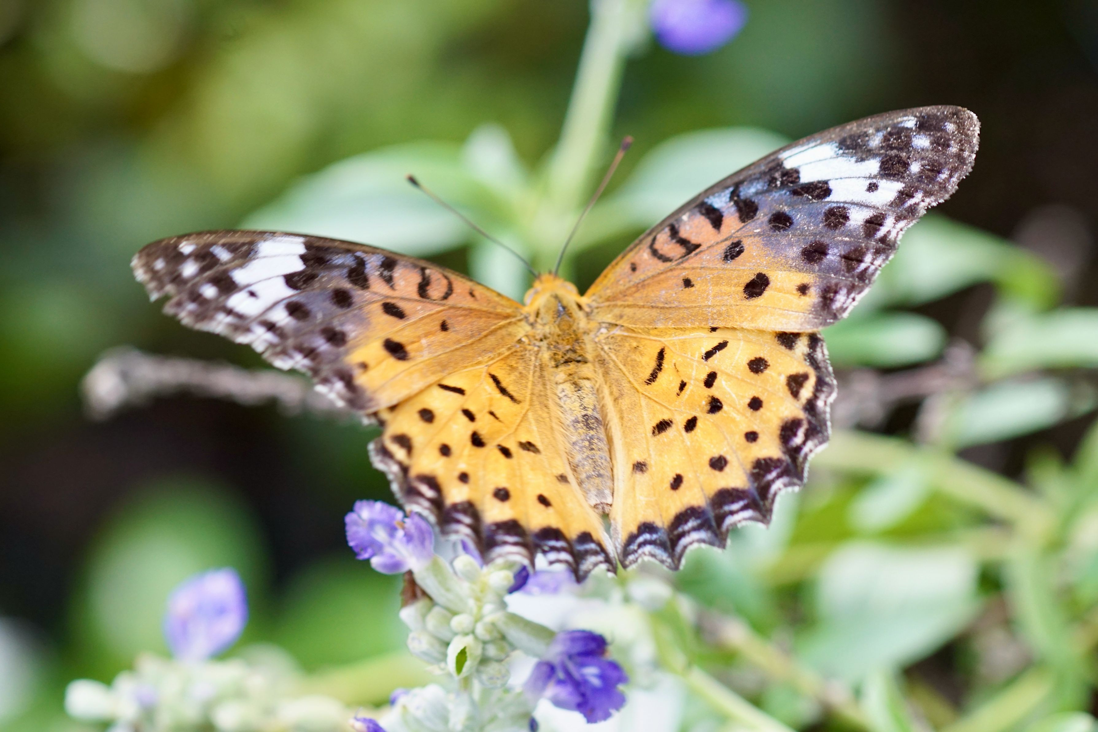 庭のブルーサルビアに見慣れないお客さん こんなにシンメトリーなんて、自然界って不思議