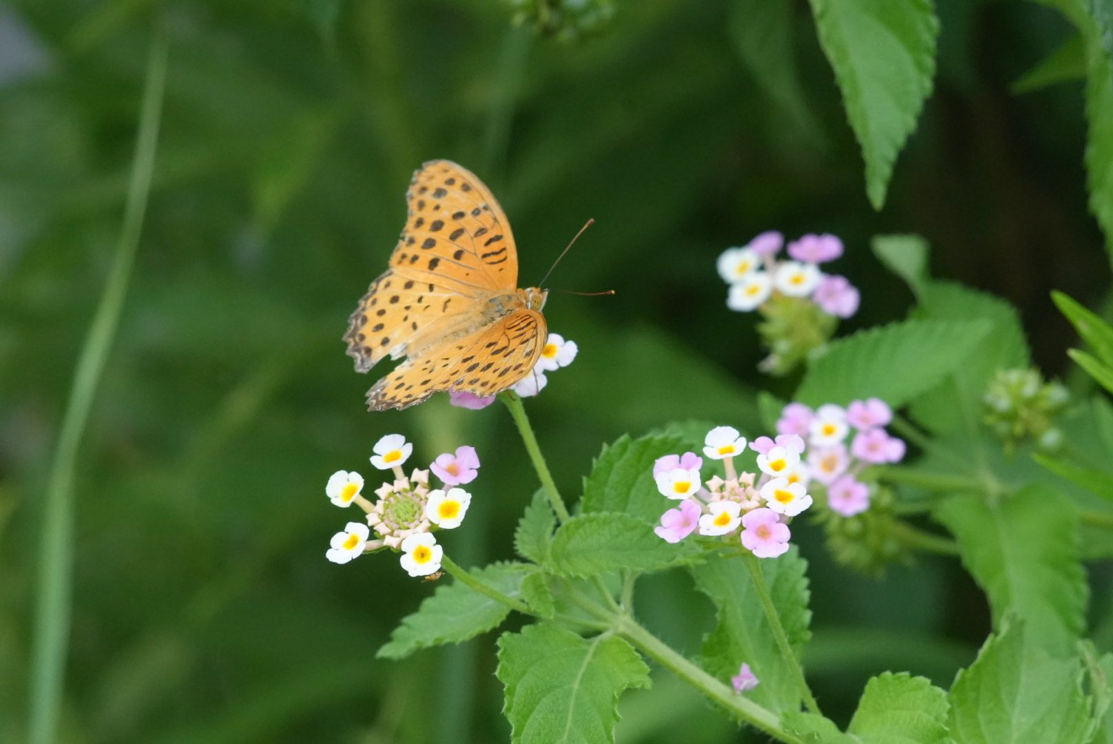 ツマグロヒョウモンがランタナの花にとまっていました。 225mm F11でマニュアル撮影しました。 なかなか自然な色合いに写っています。