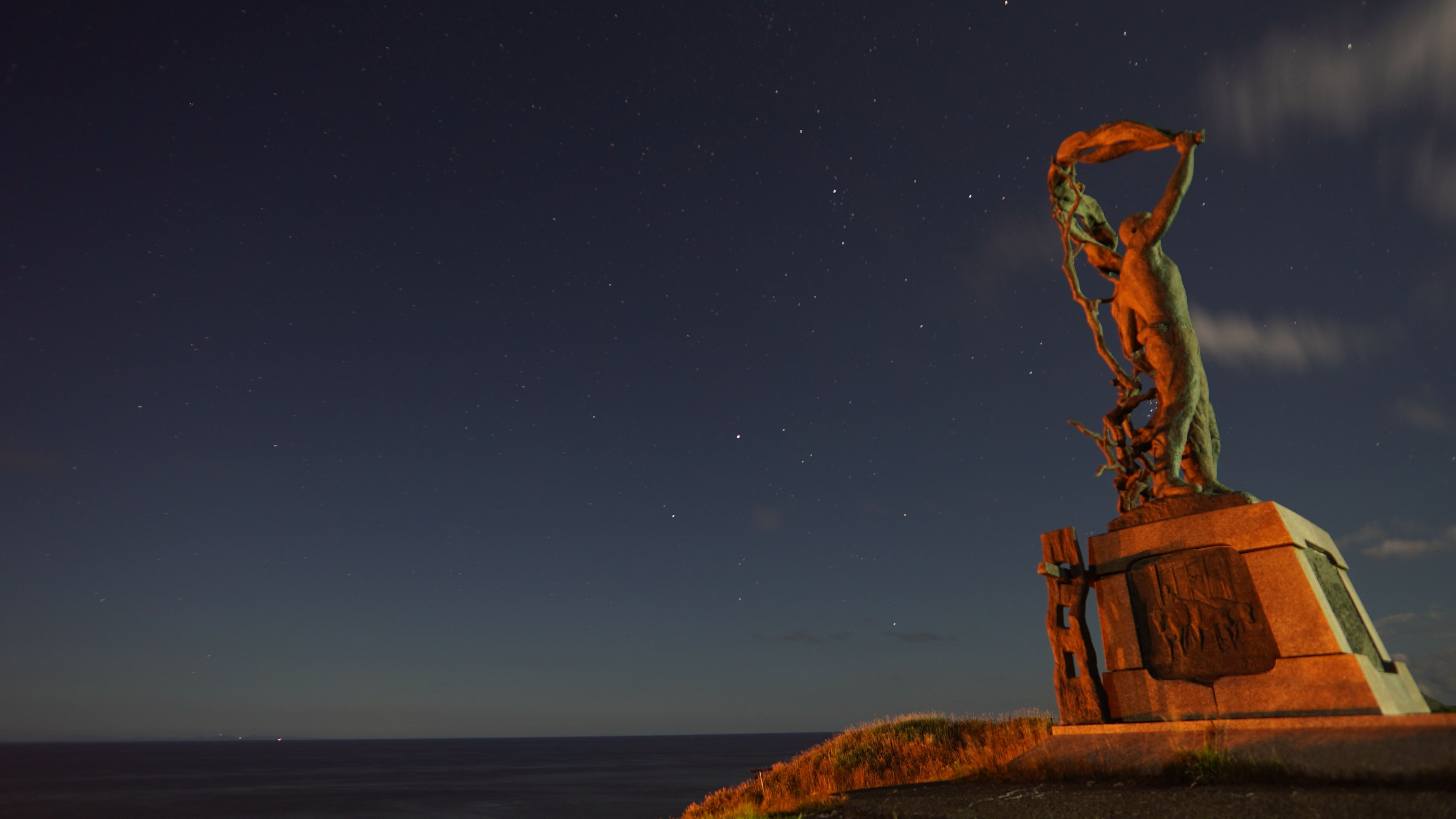 宗谷岬の丘上に宗谷平和記念公園があるので、そこのあけぼの像とペルセウス座を一緒に撮影。