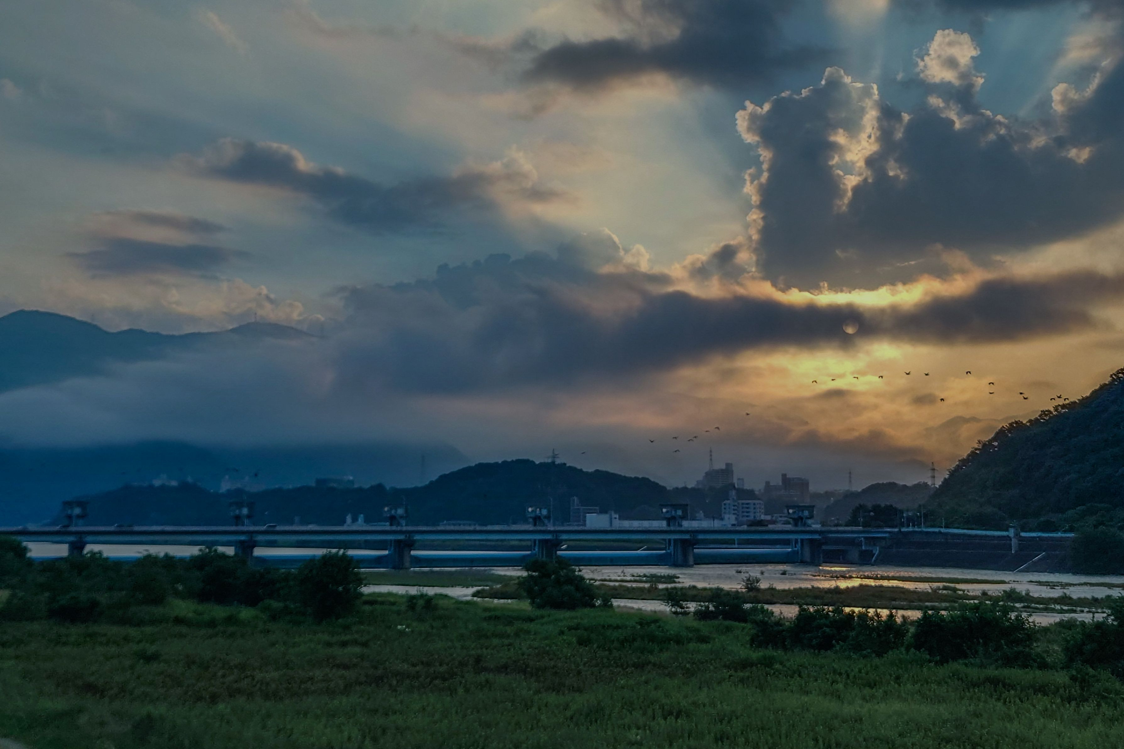 朝焼けで鴨の群れと太陽の輪郭が撮れました