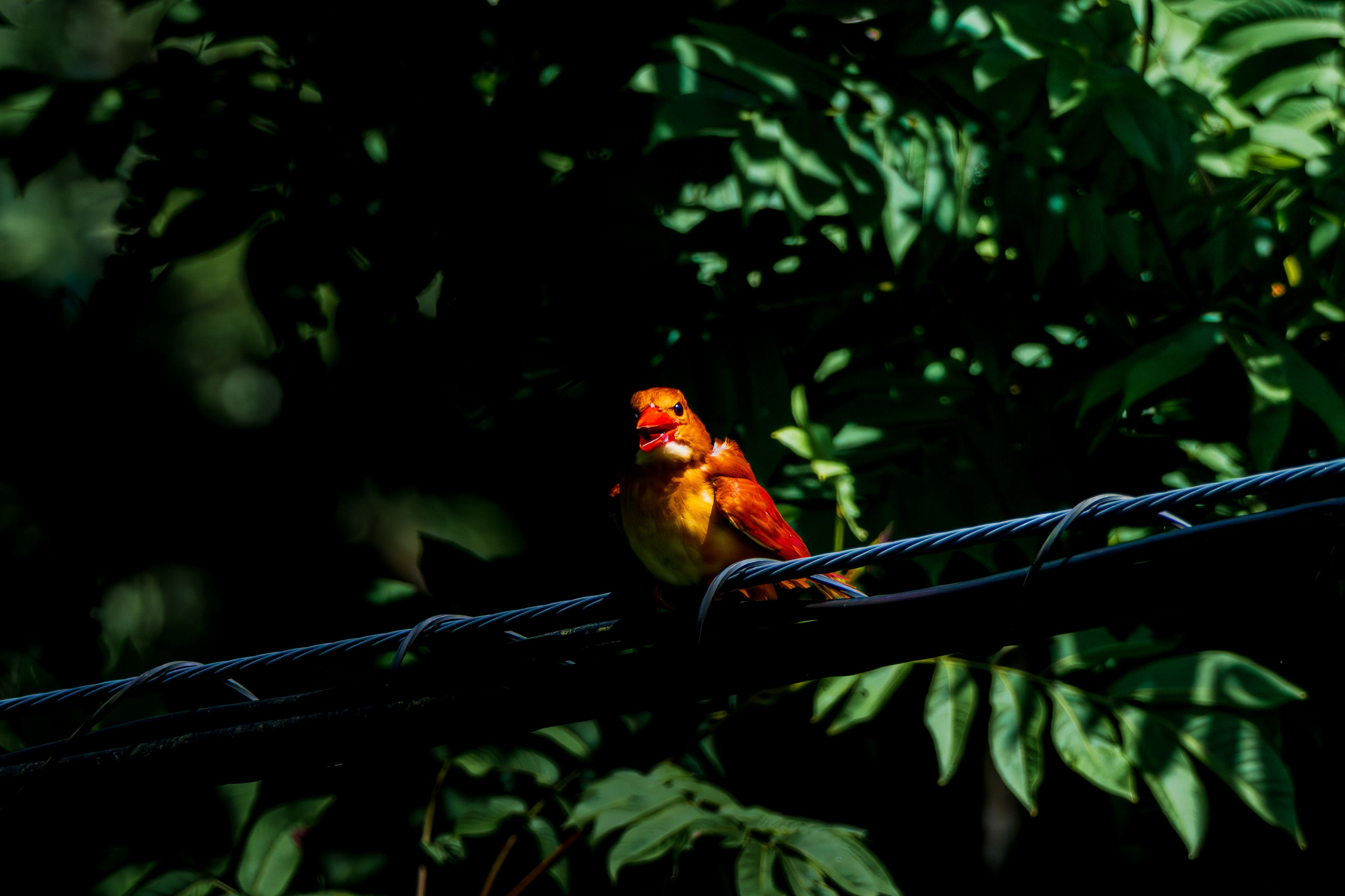 なんとなしに部屋から窓の外を見ていたら、遠くの電線にとまってる赤い鳥を発見。 「あれってアカショウビンって鳥じゃね?」と思い、急いでカメラと三脚をセッティング。 動物園以外で初めて見ました。うちの辺りにもいるんだー、と新たな発見にやや興奮。 しかしながら、いささか遠すぎました。