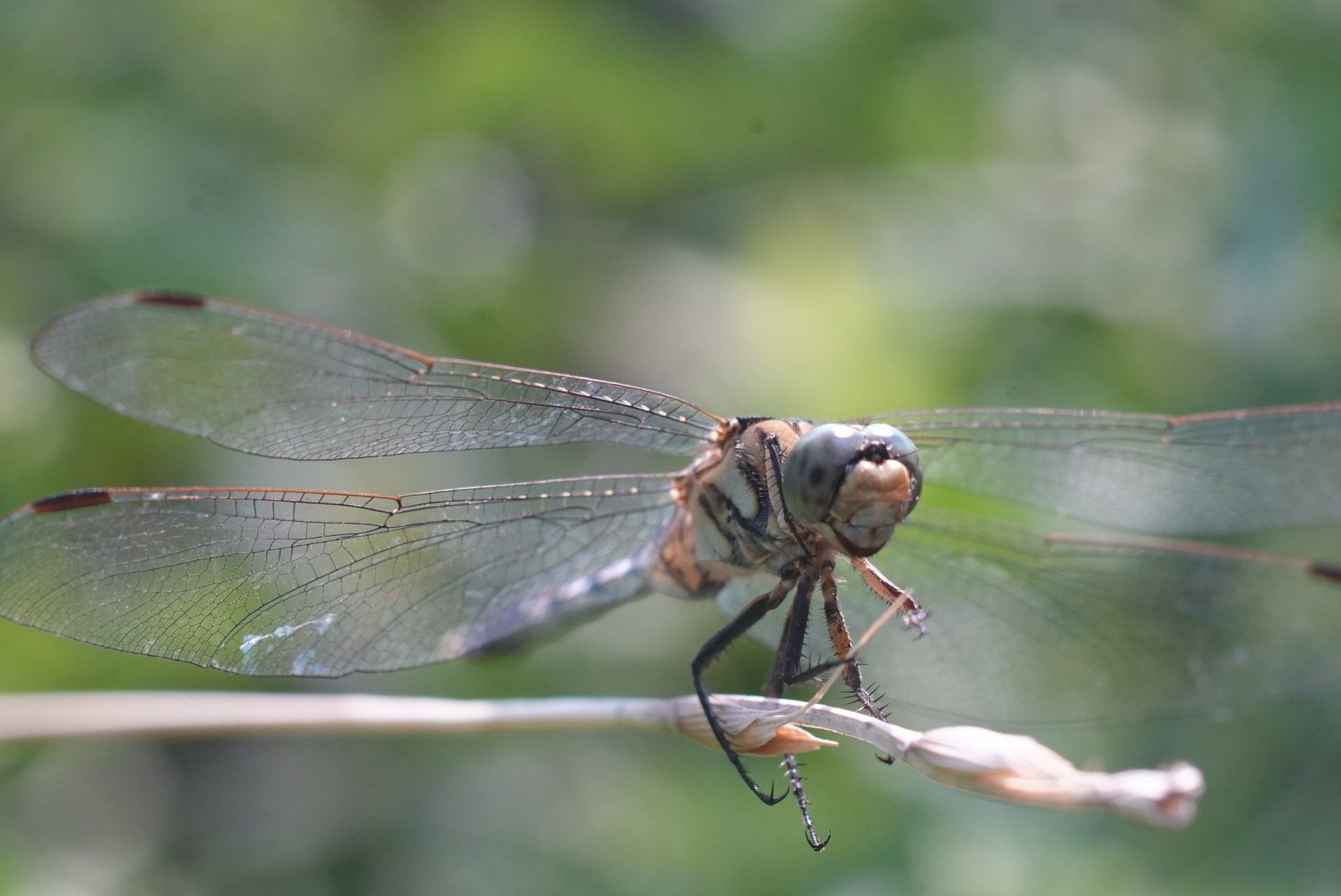 小川の上を飛んでいるシオカラトンボの雌の頭部を拡大して撮影しました。羽もなかなかキレイです。 マクロ65mm F8 でマニュアル撮影しました。