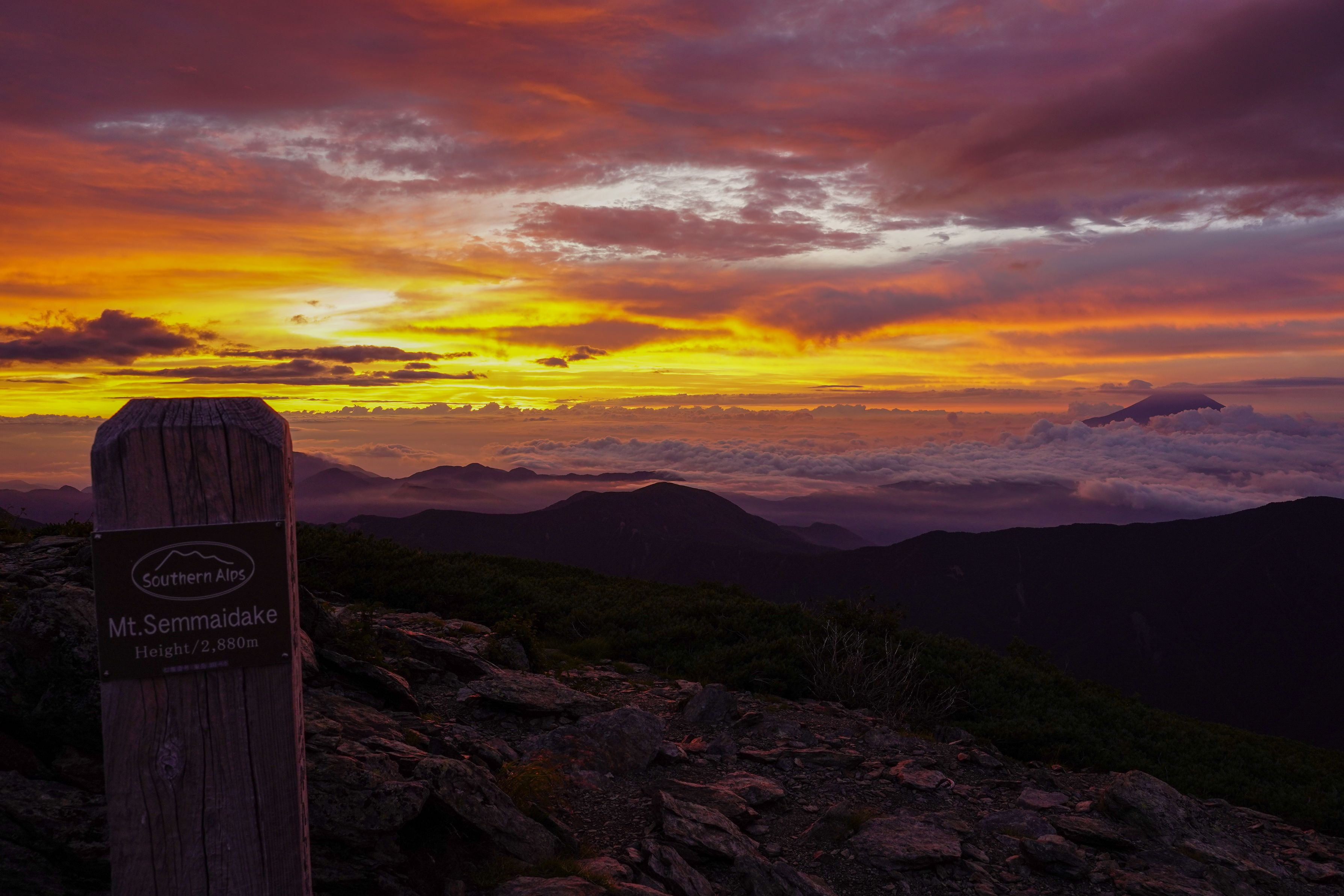 南アルプス 千枚岳からの日の出前のショット 雲が燃えるようでした