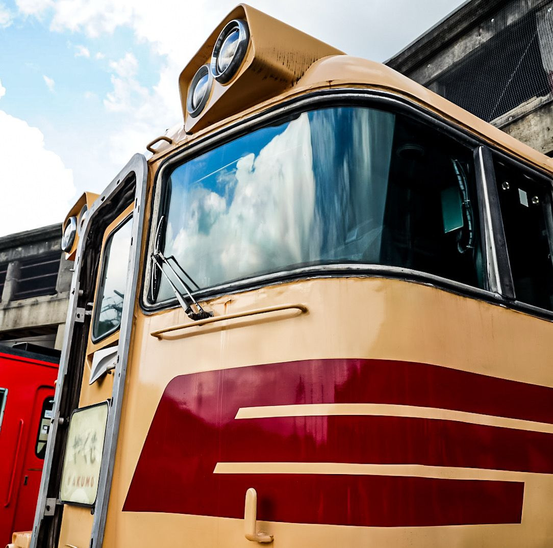 津山まなびの鉄道館に佇むキハ181。 そのフロントガラスに映り込む夏空が、 往年の名列車に新しい物語を映し出す。