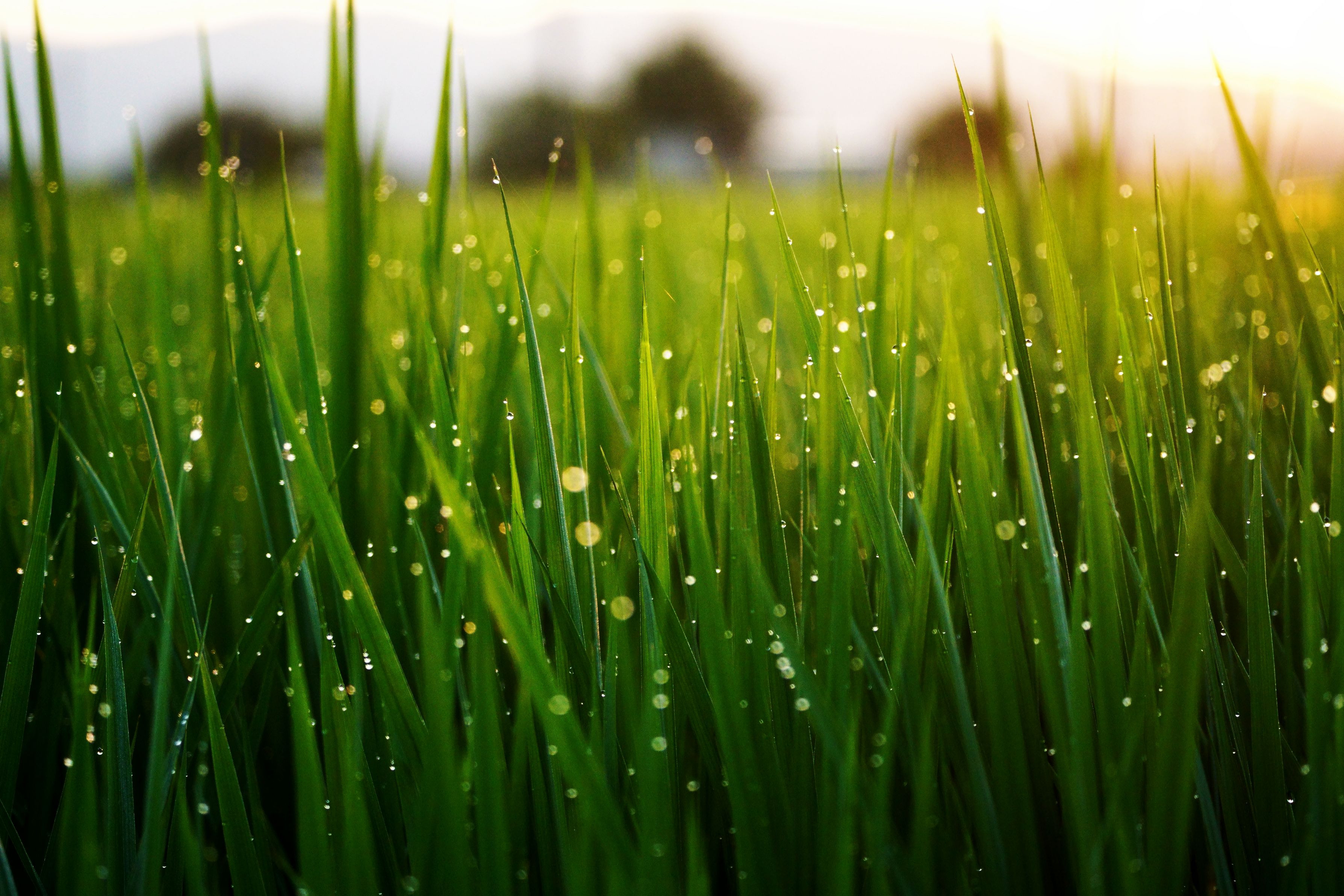 早朝散歩での1枚です。 猛暑の中、育つ稲に水滴が輝いています。 毎朝の光景です。