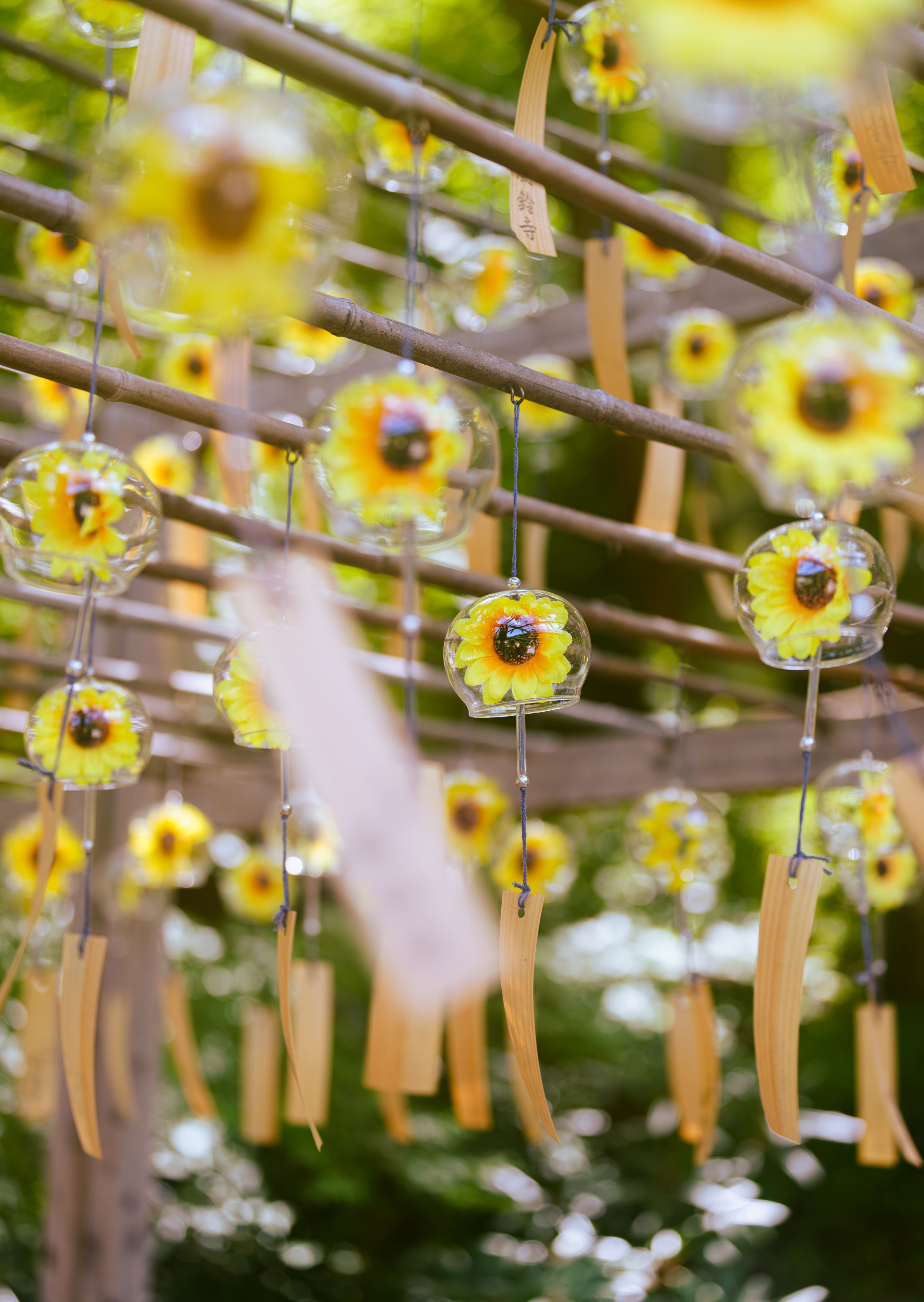 向日葵の造花があしらわれた風鈴が鳴る瞬間を切り取りました。