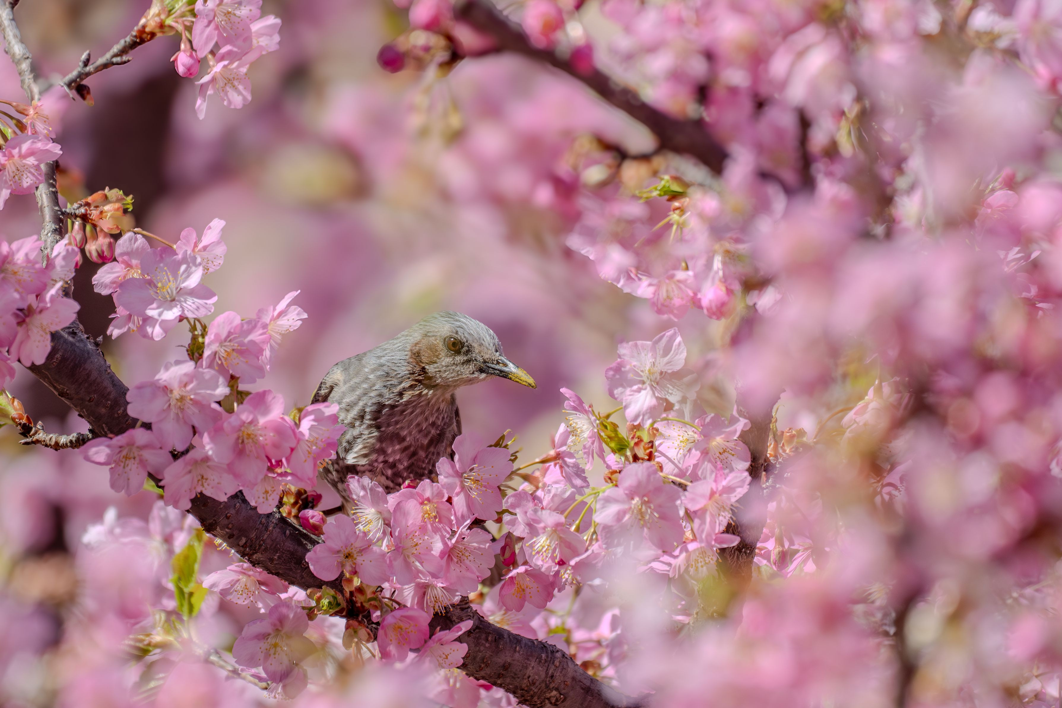満開の河津桜の花に囲まれて幸せそうなヒヨドリ。蜜も吸いたい放題です。 #ヒヨドリ#