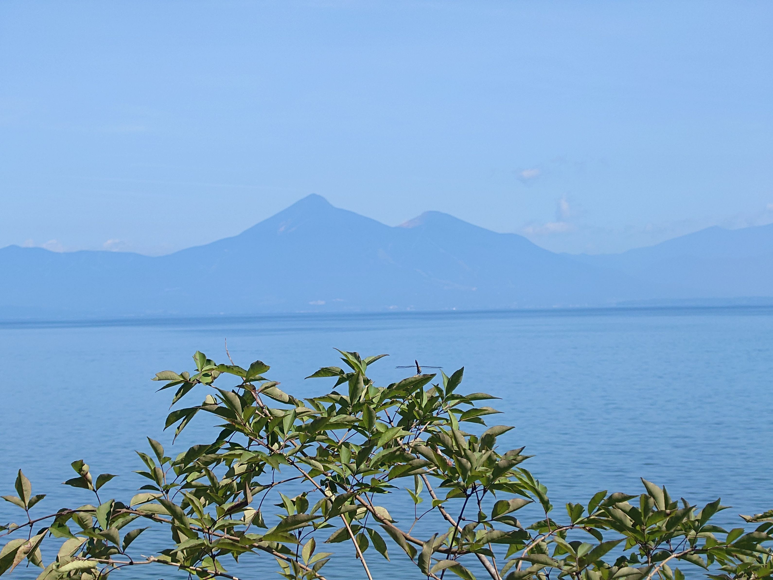 8月23日の朝よく晴れてます。磐梯山を撮影しようとしたら目の前の木にトンボがとまってました。