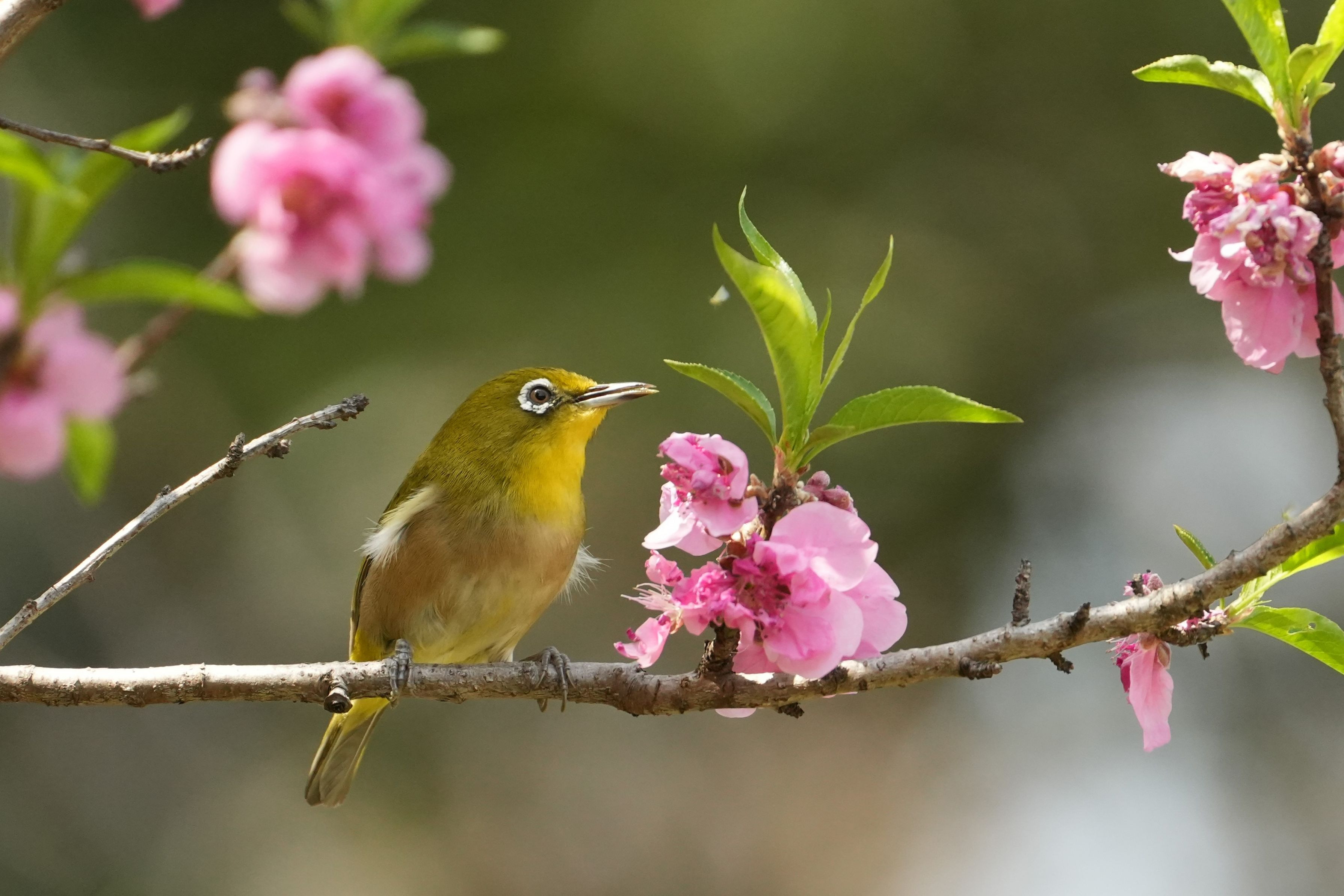 満開の桜の木に忙しく動き回る数羽のメジロから一羽を狙いました