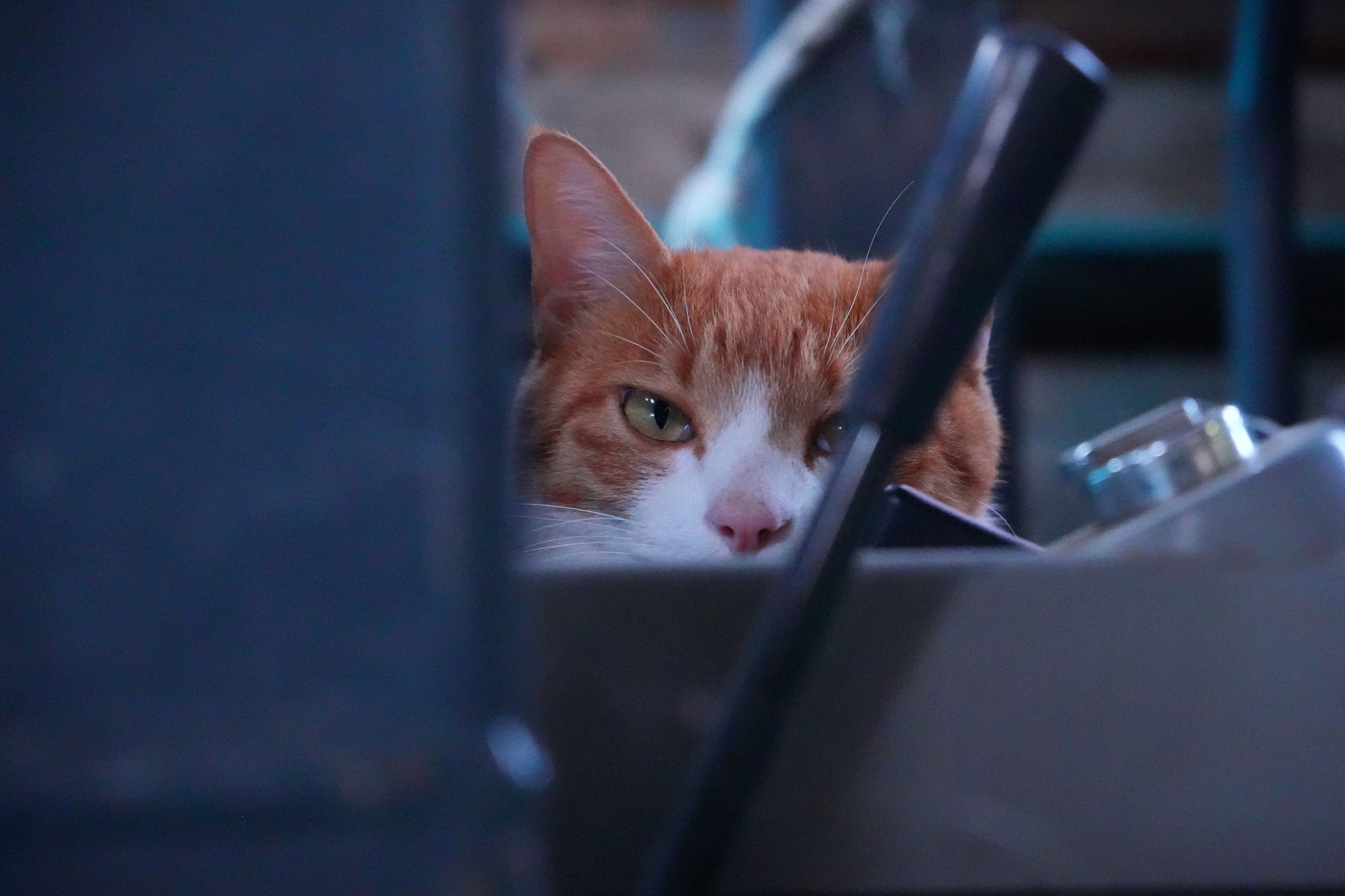深淵もまたこちらをのぞいていた(笑) 実家の猫です 重機のシートで昼寝をしていたので覗きに行ったのですが この後、怒られました