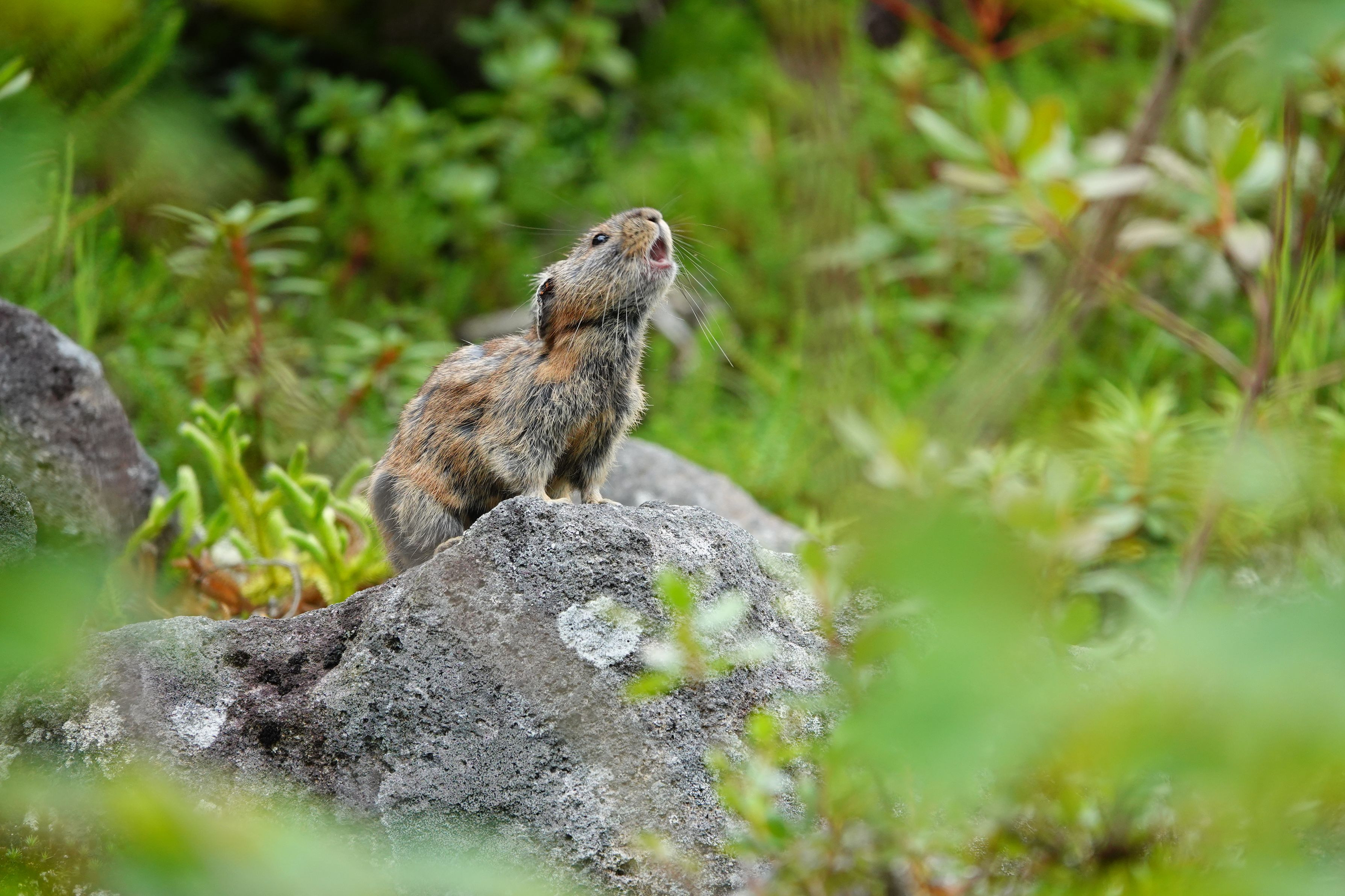 然別湖の岩場で、早朝呼び合う姿。