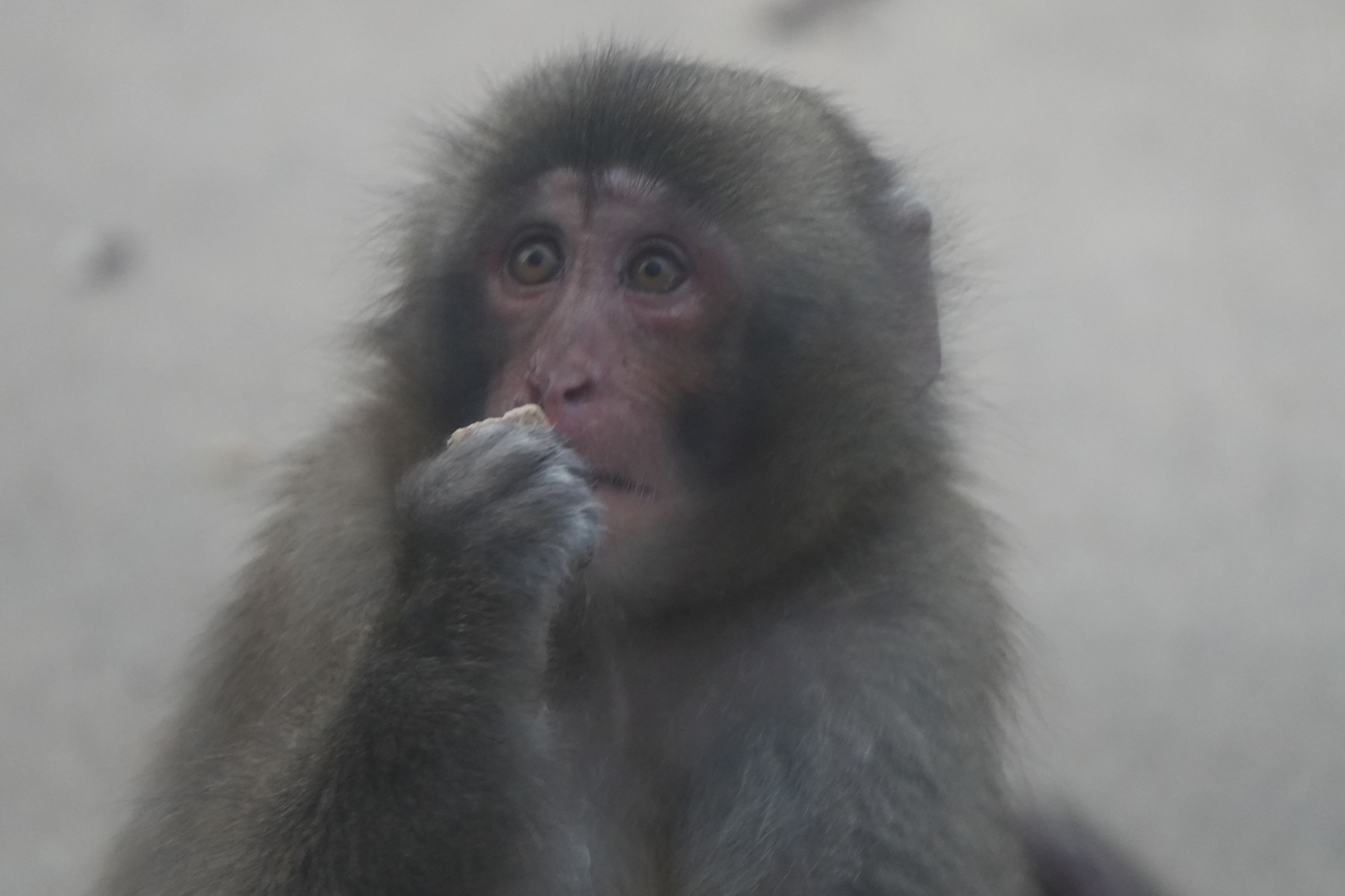 手に持った餌を食べながら涙目になっているように見えます。