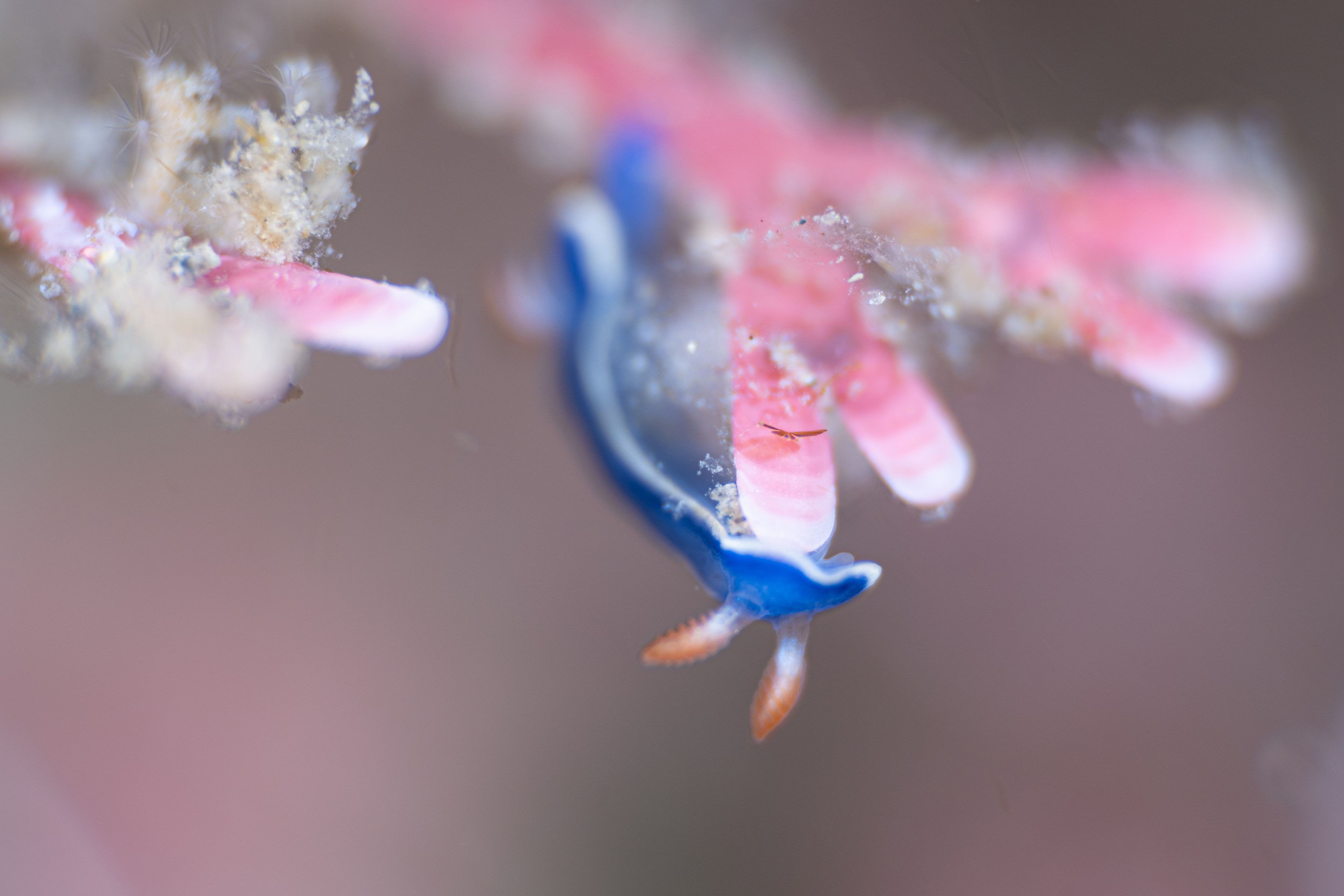 パステル背景でふわっとしたアオウミウシの撮影。 ただ米粒以下の極小サイズなので、ハウジングにはマクロコンバージョンレンズ必須です。