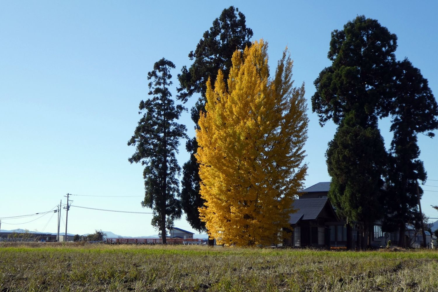 昨年の晩秋、稲刈りが終わった田園地帯を走っていたら、いきなり目の前に巨木が2本現れました!!!。 思わずバイクを止めて写真に収めました。 向かって左側の銀杏の木は見事に全面的に黄葉!!! 右側の木は常緑樹かな? この対比もまた面白いですね。