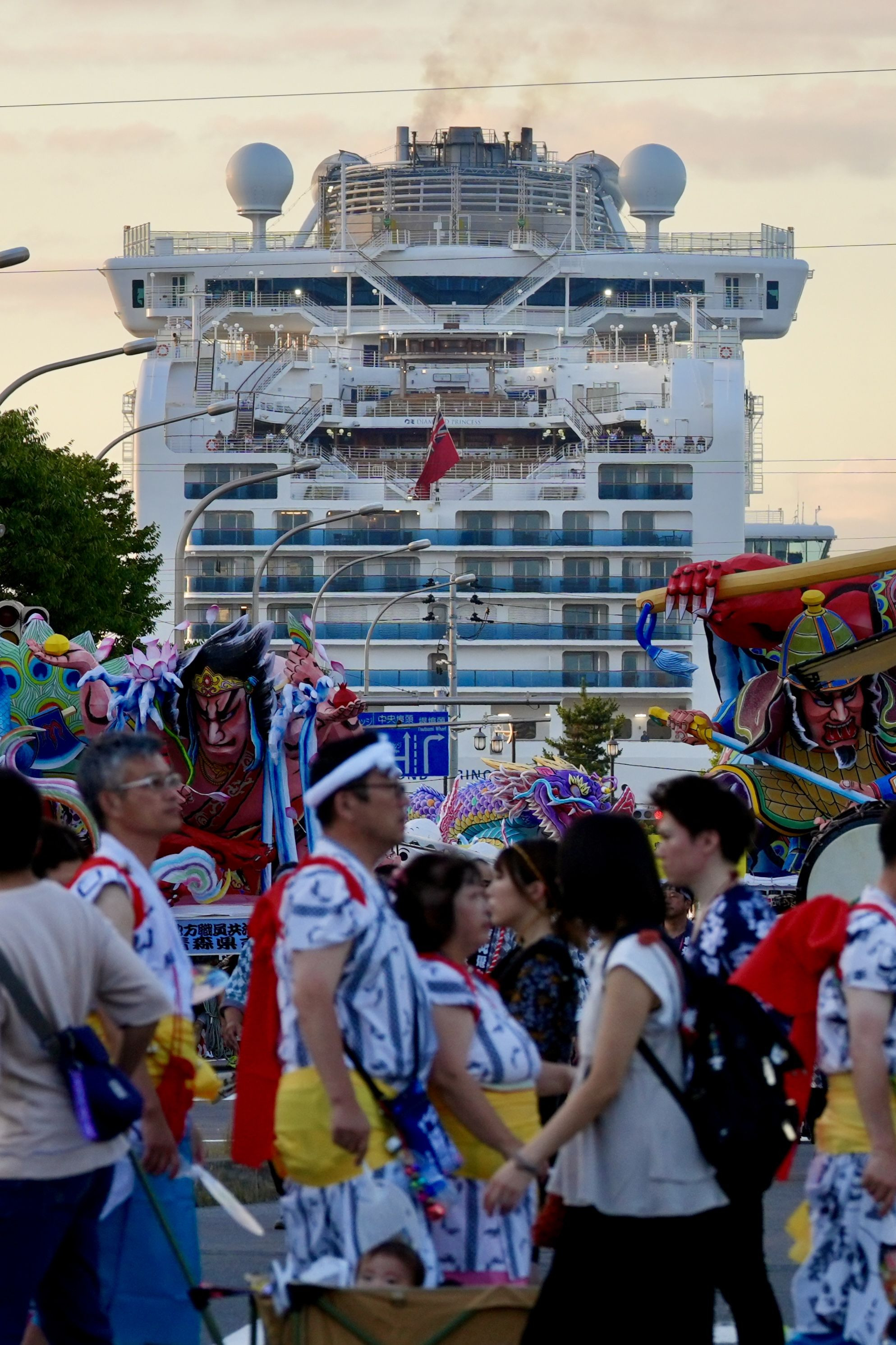 ねぶた運行初日に撮影しました。 この日はクルーズ船が入港しており、これから運行する為に待機しているねぶたと、手間の横断歩道を通行するねぶた参加者、見学者を入れてを撮りました。 クルーズ船までは距離が離れていますが、かなり大きい船だと分かります。