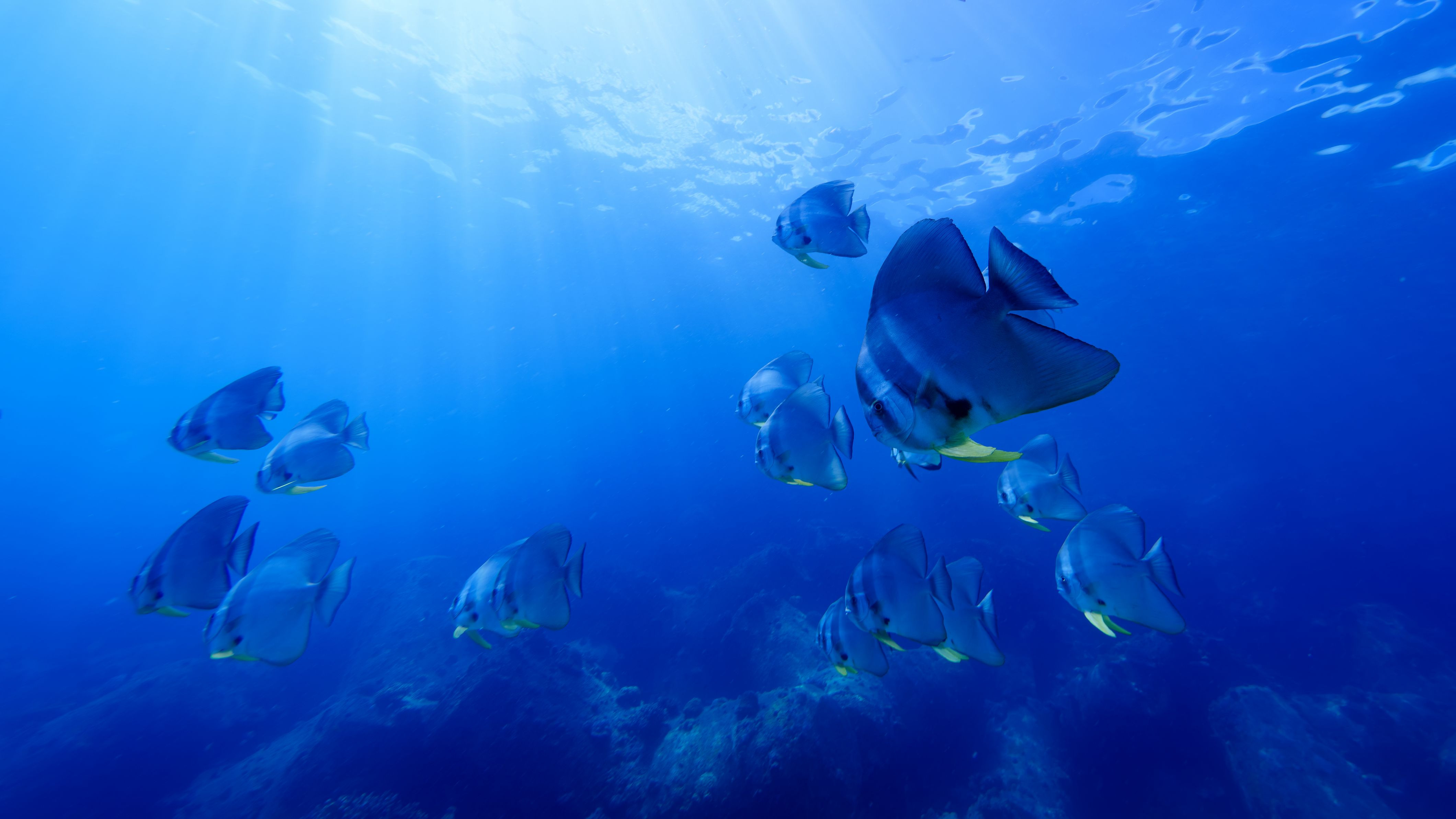 ツバメウオの群れが悠然と回遊しています 光のカーテンが見える角度で撮影 群れがもう少しギュッとしてくれているといいのですがなかなか思うようにはいきません