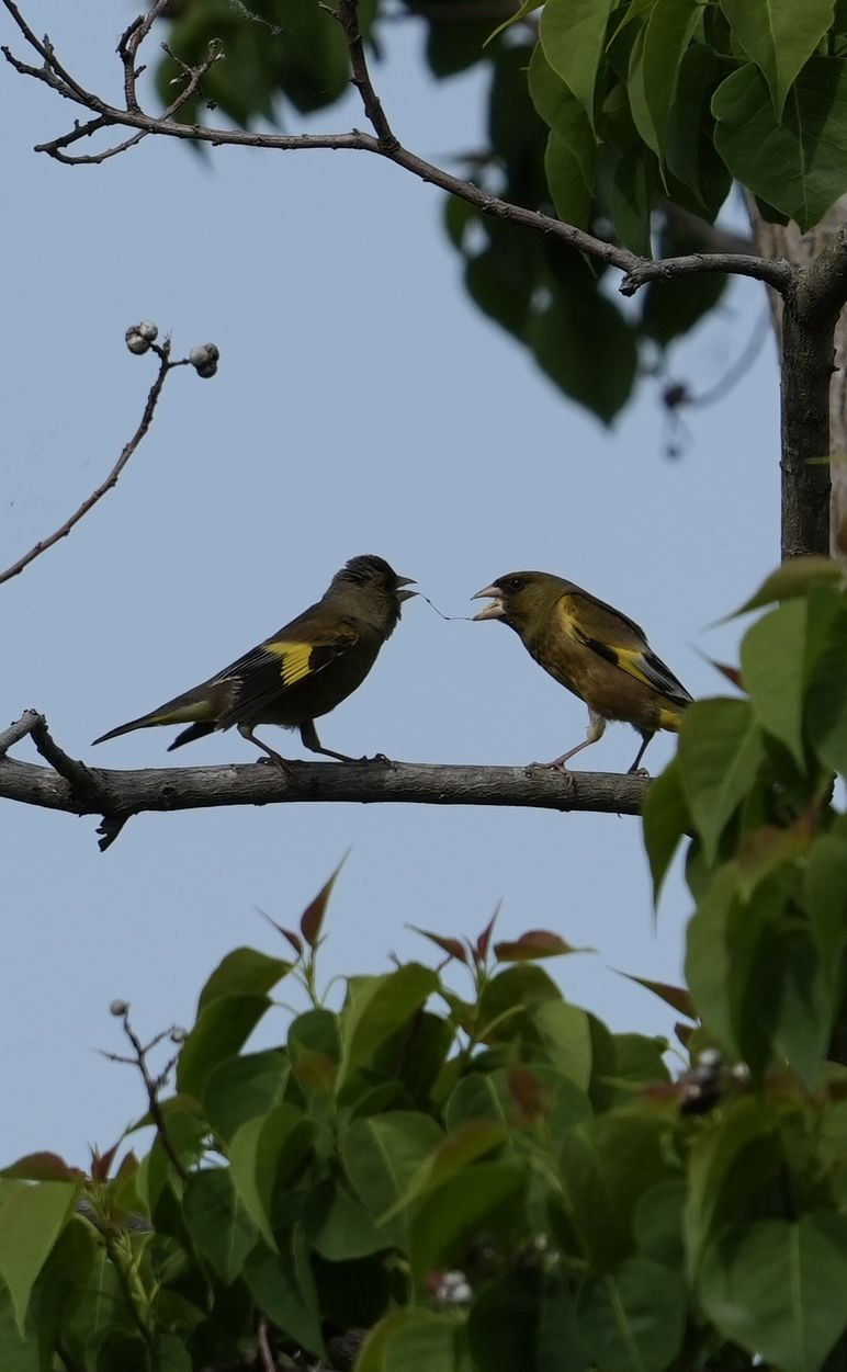だいぶ大きくなった幼鳥に親鳥のカワラヒワ(右側)が餌をあげていました。微笑ましく感じました。親鳥が飛び立った後も、幼鳥はしばらく同じ枝にとまっていました。