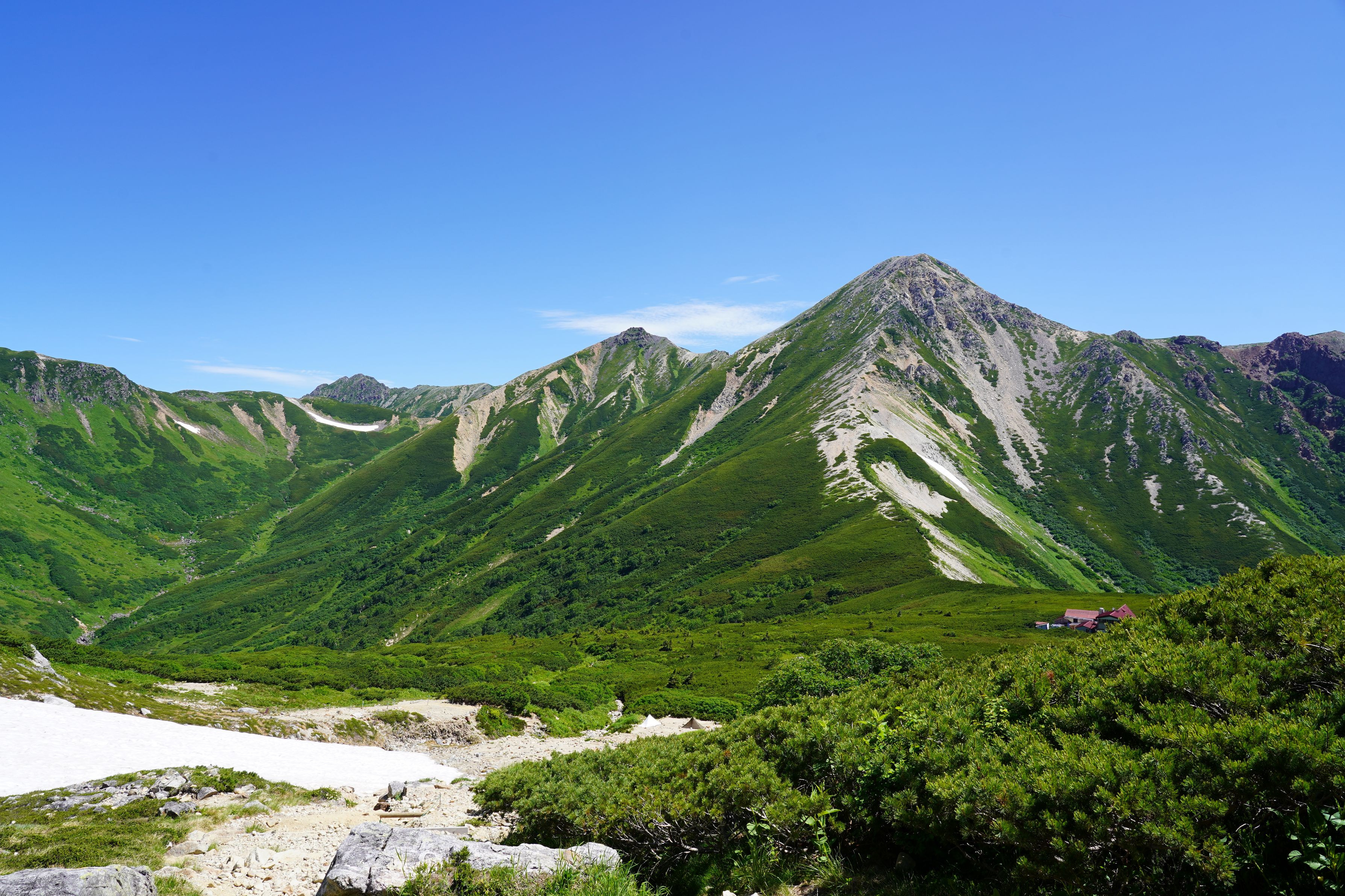 北アルプス黒部源流の山小屋 水晶小屋から望む裏銀座縦走路と野口五郎岳