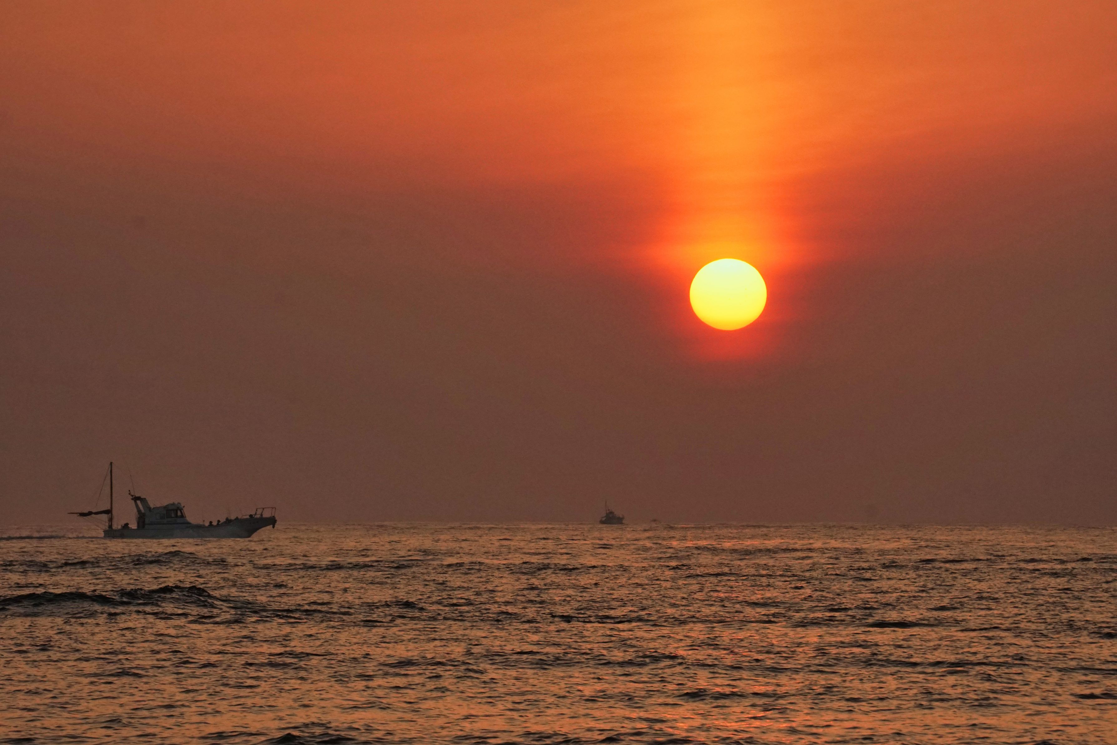 8月最後の日の日の出。 海上は雲の中にお日様の姿が見えてきました。 漁船が来たのですが、予想以上に速いので ブレないように焦りました(^^;