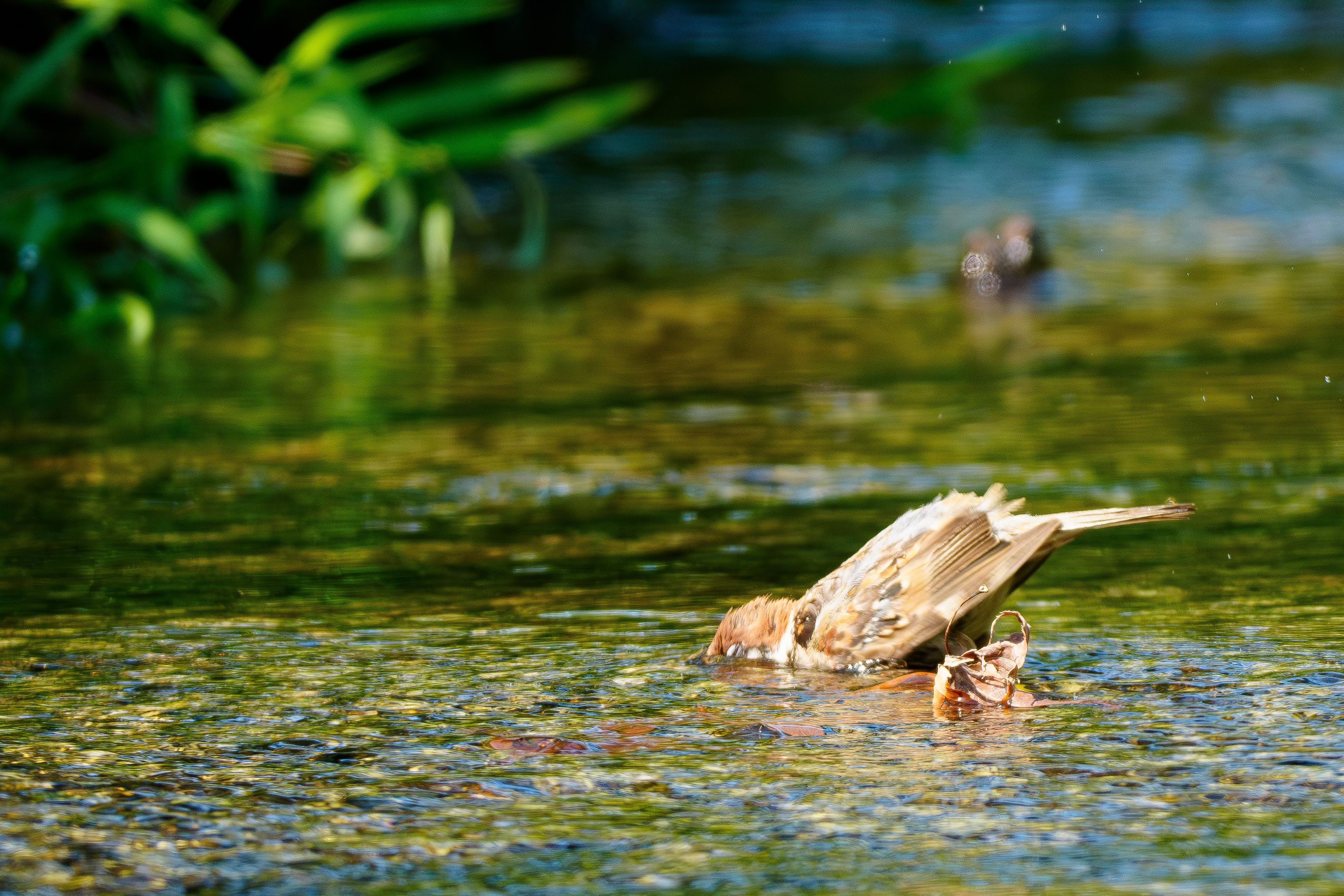 スズメが水浴びしながら顔を洗っていました。
