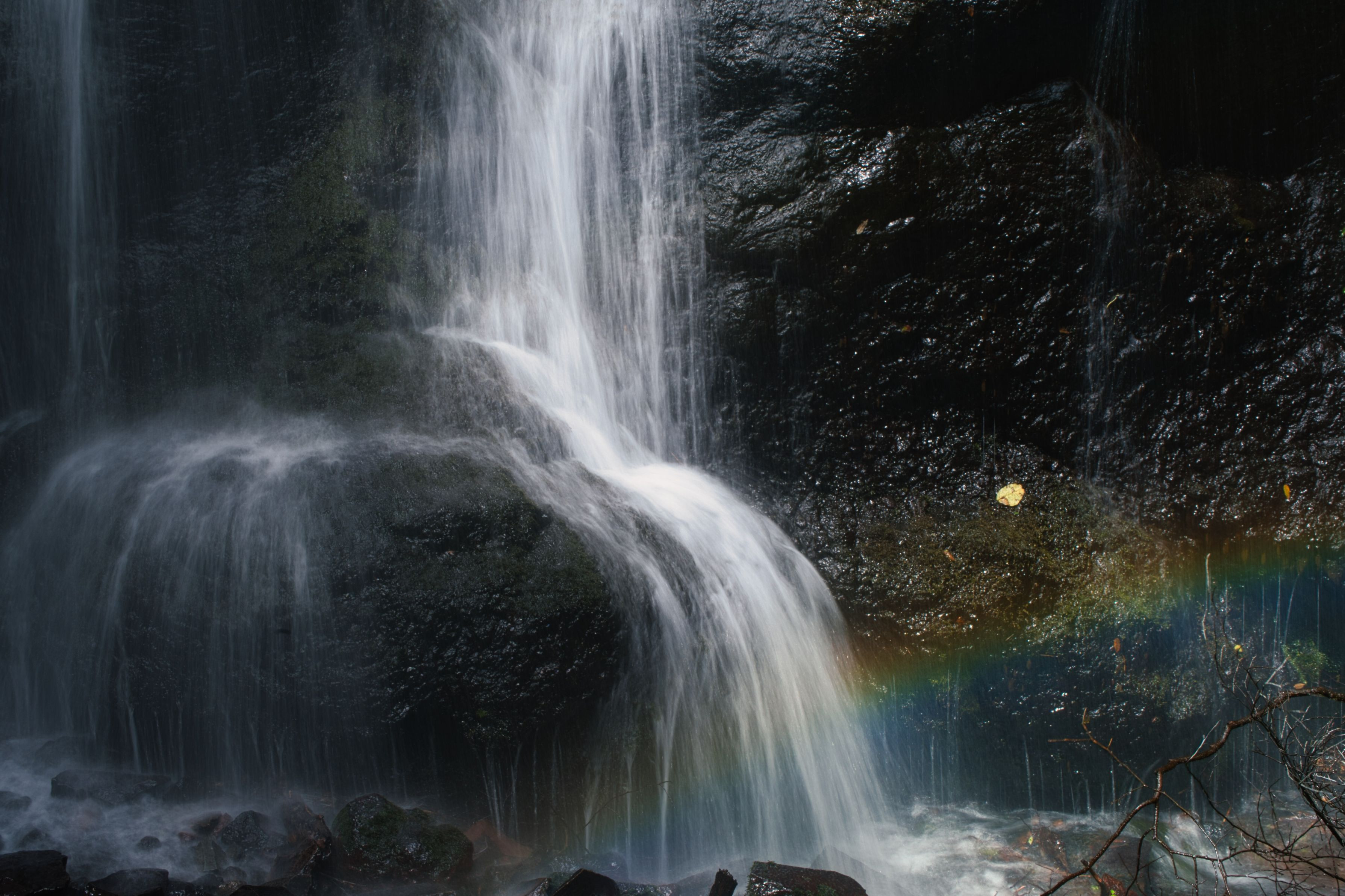 豪快な滝の流れと虹に落ち葉のワンポイント 有名な滝の脇に目立たずに流れる支流をすぐ近くで中望遠で切り取っています😊