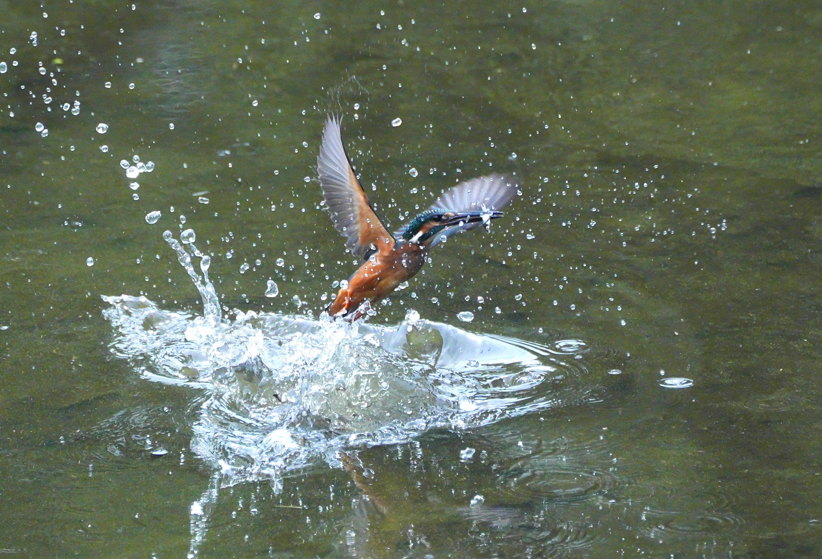 かわせみ水面からの飛び出し 飛び込み、飛び出し予測水面に照準器あて連写 α9Ⅲ プレキャプチャー撮影 肉眼では早くて見れないが、カメラが撮ってくれる。