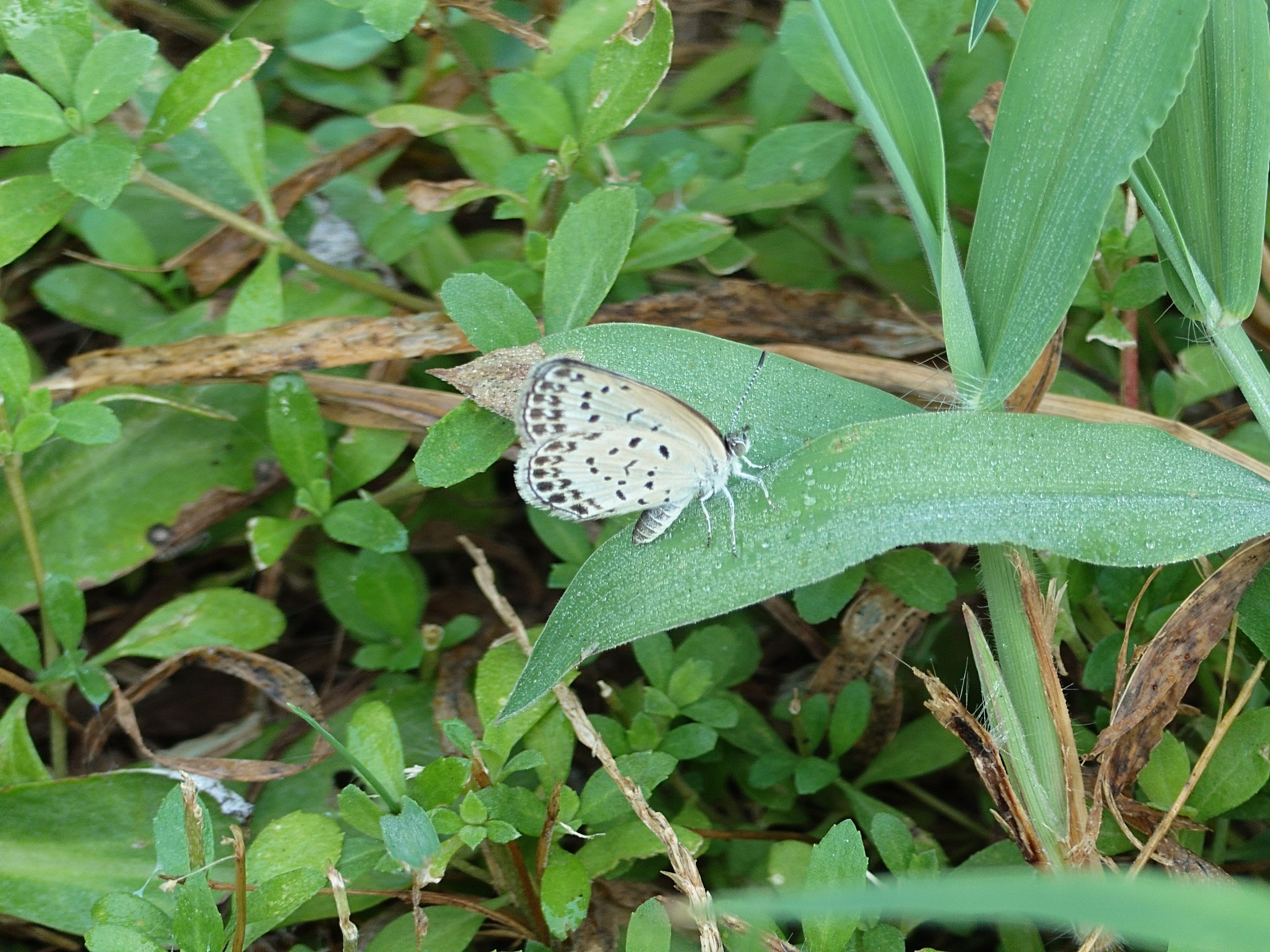 朝のわんことの散歩をした後に庭で遊んでいたらシジミチョウが飛んできました。きれいです。草の露をなめているのか?