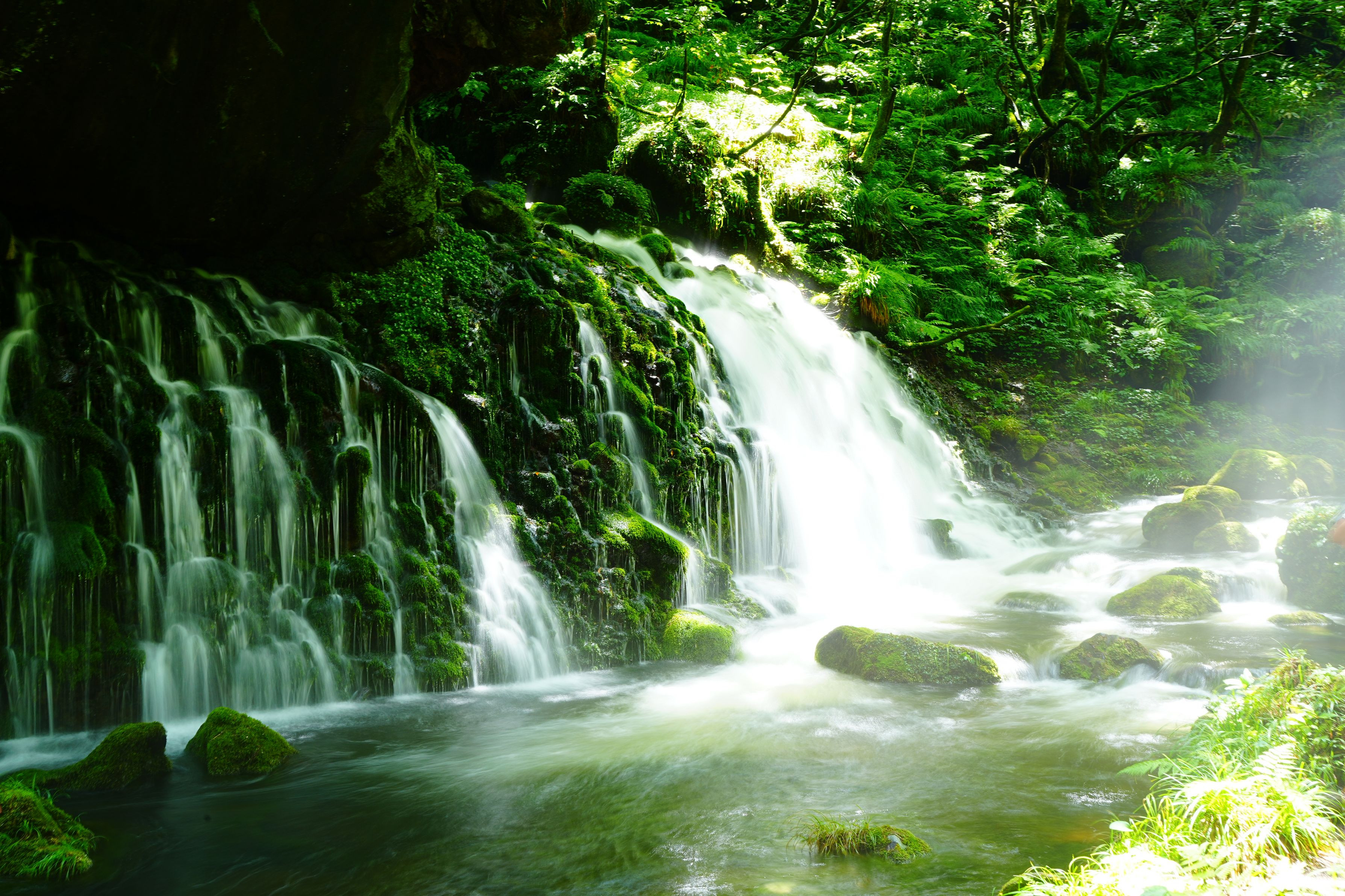 秋田県・元滝伏流水です。 岩肌を流れる水はこの猛暑を涼しくしてくれます。