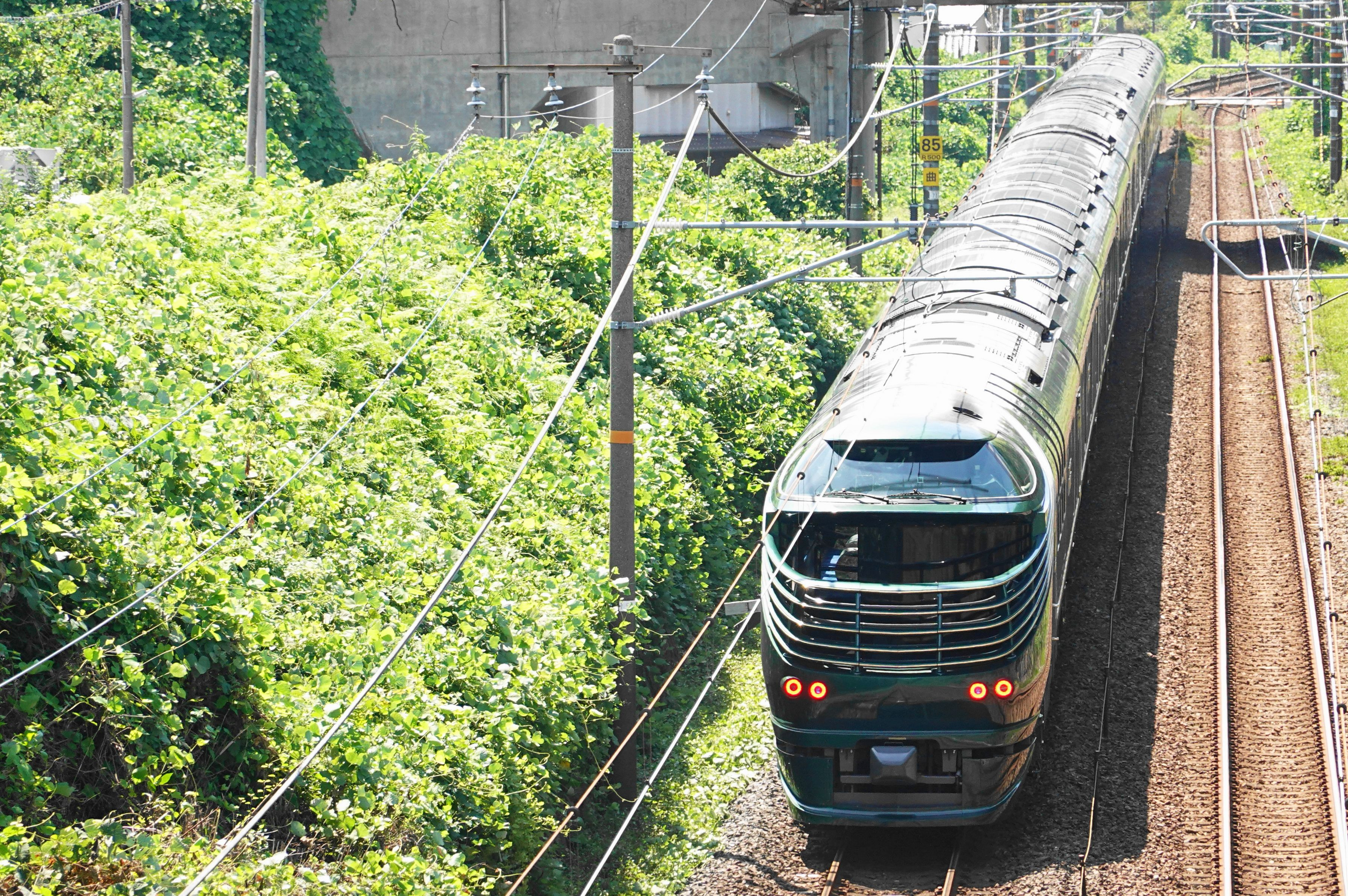 [9月なのに猛暑日・山陽コース下り] 跨線橋よりレンズ先端が金網の網の目をくぐれる 秘密兵器[RX100M7]にて「TWILIGHT EXPRESS 瑞風」 の♪ヘッドライト・テールライト♪をゲット
